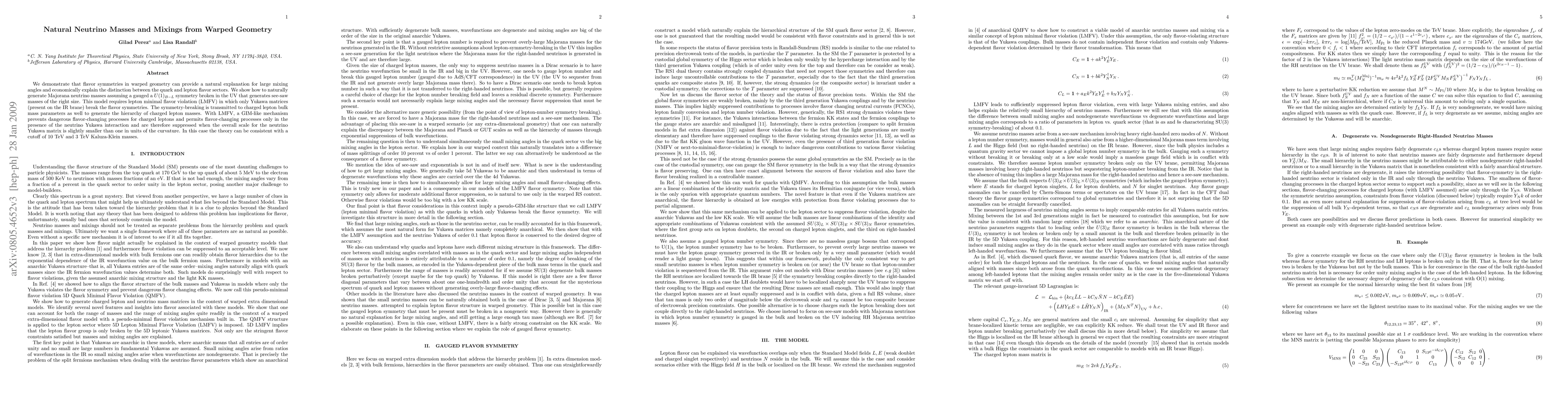 We demonstrate that flavor symmetries in warped geometry can provide a natural explanation for large mixing angles and economically explain the distinction between the quark and lepton flavor sectors. We show how to naturally generate Majorana neutrino masses assuming a gauged a U(1)_{B-L} symmetry broken in the UV that generates see-saw masses of the right size. This model requires lepton minimal flavor violation (LMFV) in which only Yukawa matrices (present on the IR brane) break the flavor symmetries. The symmetry-breaking is transmitted to charged lepton bulk mass parameters as well to generate the hierarchy of charged lepton masses. With LMFV, a GIM-like mechanism prevents dangerous flavor-changing processes for charged leptons and permits flavor-changing processes only in the presence of the neutrino Yukawa interaction and are therefore suppressed when the overall scale for the neutrino Yukawa matrix is slightly smaller than one in units of the curvature. In this case the theory can be consistent with a cutoff of 10 TeV and 3 TeV Kaluza-Klein masses.