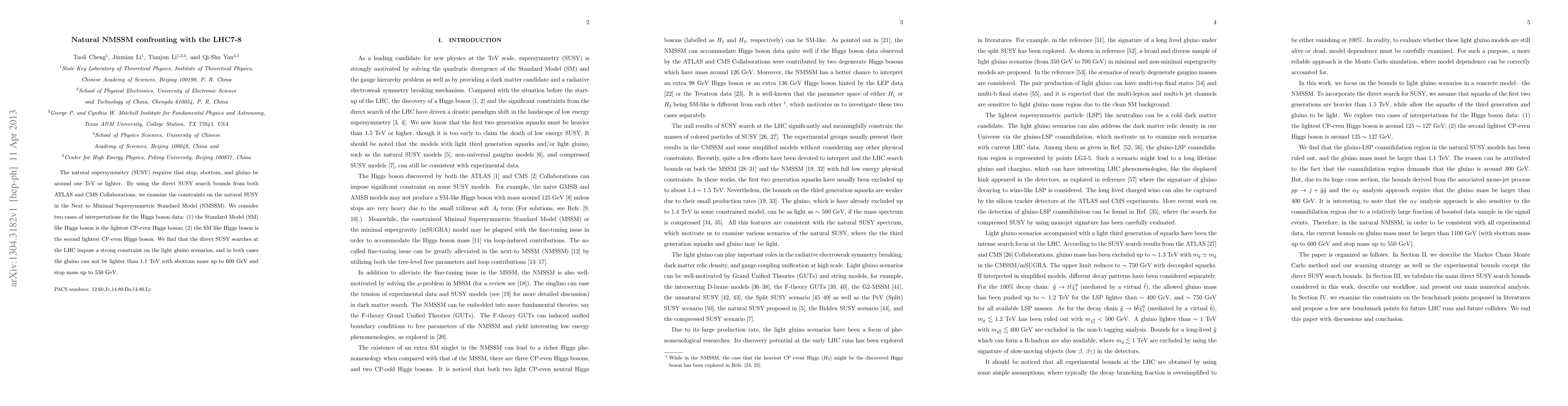 The natural supersymmetry (SUSY) requires that stop, sbottom, and gluino be around one TeV or lighter. By using the direct SUSY search bounds from both ATLAS and CMS Collaborations, we examine the constraints on the natural SUSY in the Next to Minimal Supersymmetric Standard Model (NMSSM). We consider two cases of interpretations for the Higgs boson data: (1) the Standard Model (SM) like Higgs boson is the lightest CP-even Higgs boson; (2) the SM like Higgs boson is the second lightest CP-even Higgs boson. We find that the direct SUSY searches at the LHC impose a strong constraint on the light gluino scenarios, and in both cases the gluino can not be lighter than 1.1 TeV with sbottom mass up to 600 GeV and stop mass up to 550 GeV.
