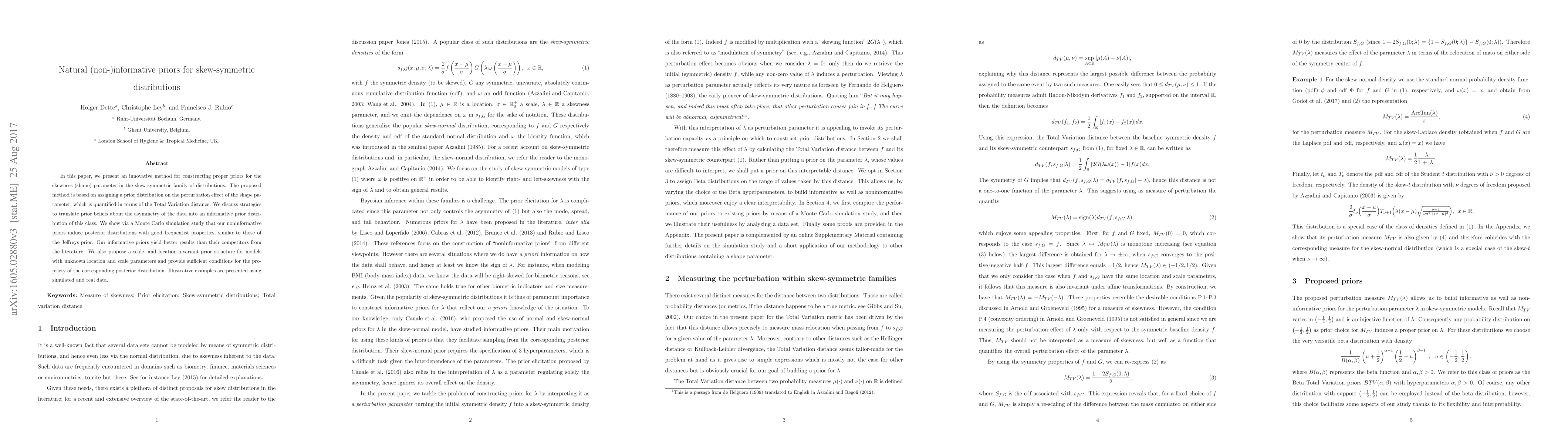 This paper introduces a novel method for constructing proper priors for skewness in skew-symmetric distributions, using a prior based on the Total Variation distance. It demonstrates that the proposed noninformative priors perform well in frequentist properties, while informative priors outperform existing methods, and provides a scale- and location-invariant prior structure with sufficient propriety conditions.