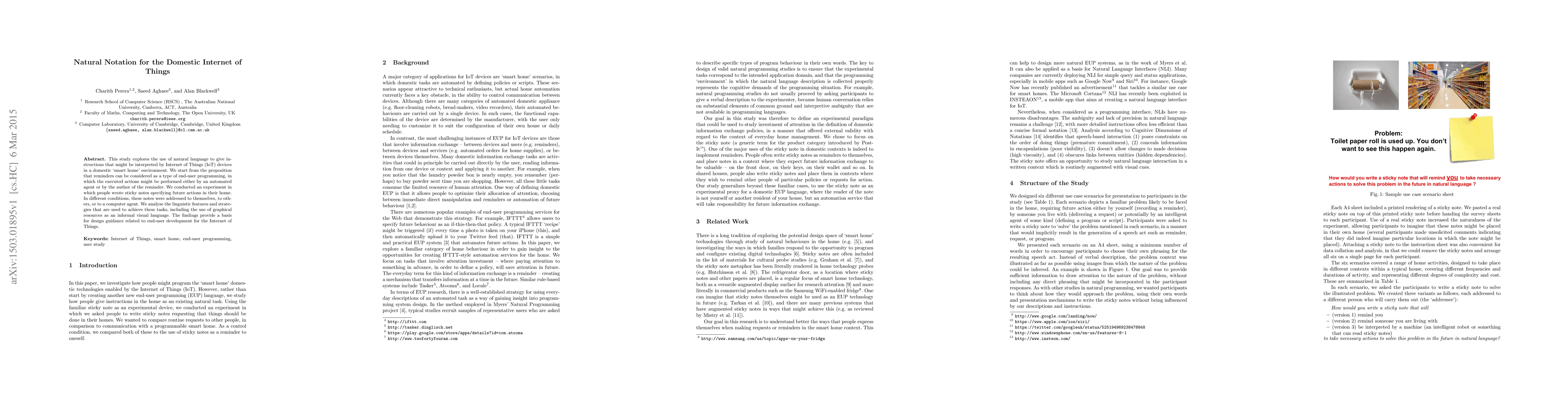 This study investigates how natural language instructions can control IoT devices in smart homes, treating reminders as a form of end-user programming. An experiment involving sticky notes revealed linguistic features and strategies used to communicate with IoT devices, offering design insights for user-friendly IoT systems.