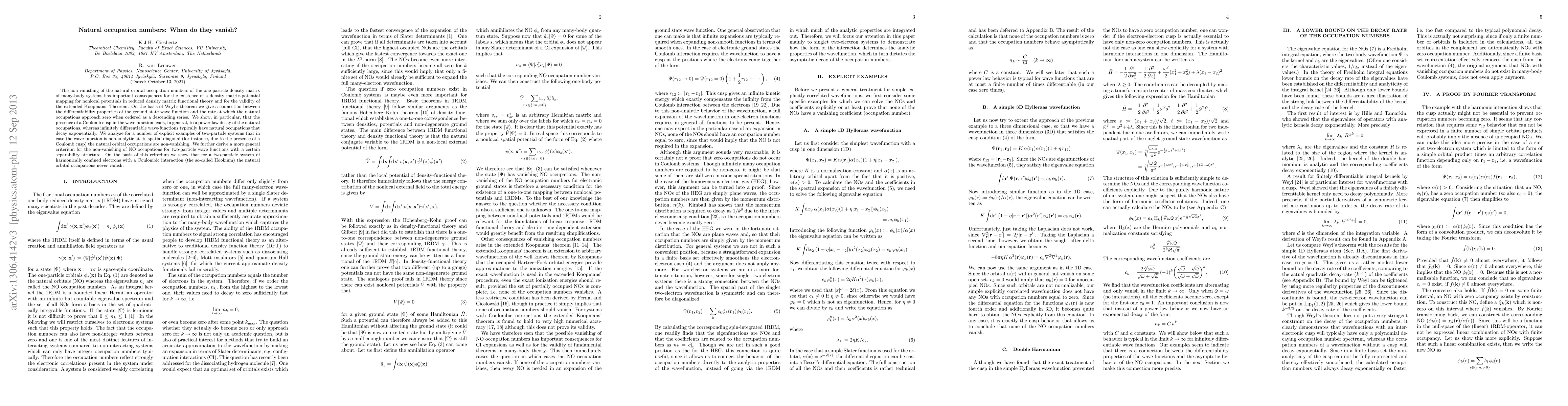 This paper explores how natural orbital occupation numbers in many-body systems behave, finding that certain wave functions can lead to non-vanishing occupations even when expected to do so, with implications for density matrix functional theory and Koopmans' Theorem.