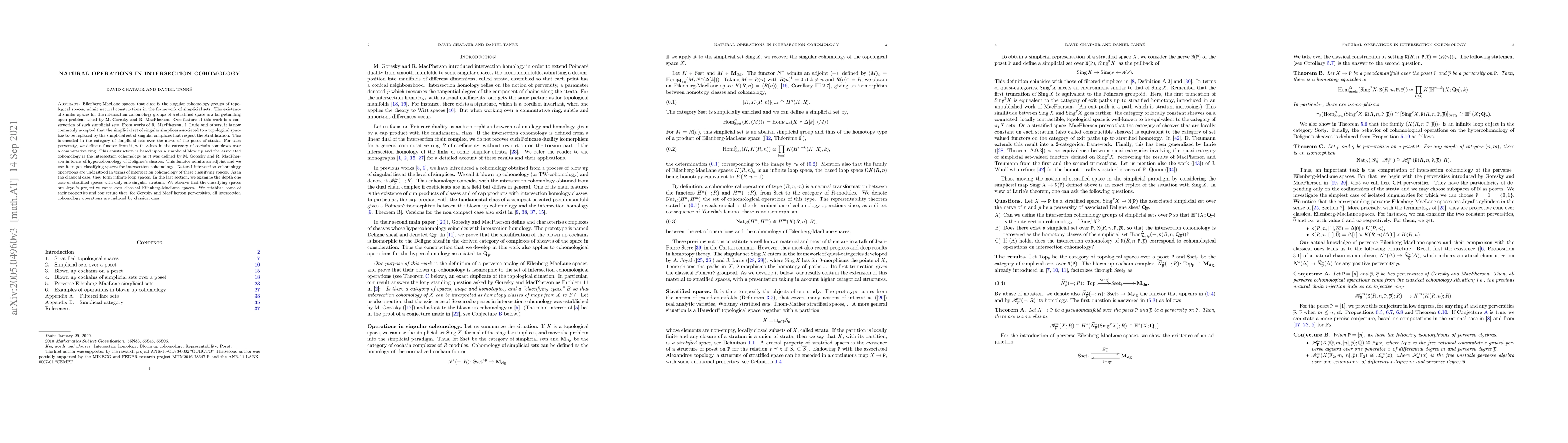 Eilenberg-MacLane spaces, that classify the singular cohomology groups of topological spaces, admit natural constructions in the framework of simplicial sets. The existence of similar spaces for the intersection cohomology groups of a stratified space is a long-standing open problem asked by M. Goresky and R. MacPherson. One feature of this work is a construction of such simplicial sets. From works of R. MacPherson, J. Lurie and others, it is now commonly accepted that the simplicial set of singular simplices associated to a topological space has to be replaced by the simplicial set of singular simplices that respect the stratification. This is encoded in the category of simplicial sets over the nerve of the poset of strata. For each perversity, we define a functor from it, with values in the category of cochain complexes over a commutative ring. This construction is based upon a simplicial blow up and the associated cohomology is the intersection cohomology as it was defined by M. Goresky and R. MacPherson in terms of hypercohomology of Delignes's sheaves. This functor admits an adjoint and we use it to get classifying spaces for intersection cohomology. Natural intersection cohomology operations are understood in terms of intersection cohomology of these classifying spaces. As in the classical case, they form infinite loop spaces. In the last section, we examine the depth one case of stratified spaces with only one singular stratum. We observe that the classifying spaces are Joyal's projective cones over classical Eilenberg-MacLane spaces. We establish some of their properties and conjecture that, for Goresky and MacPherson perversities, all intersection cohomology operations are induced by classical ones.