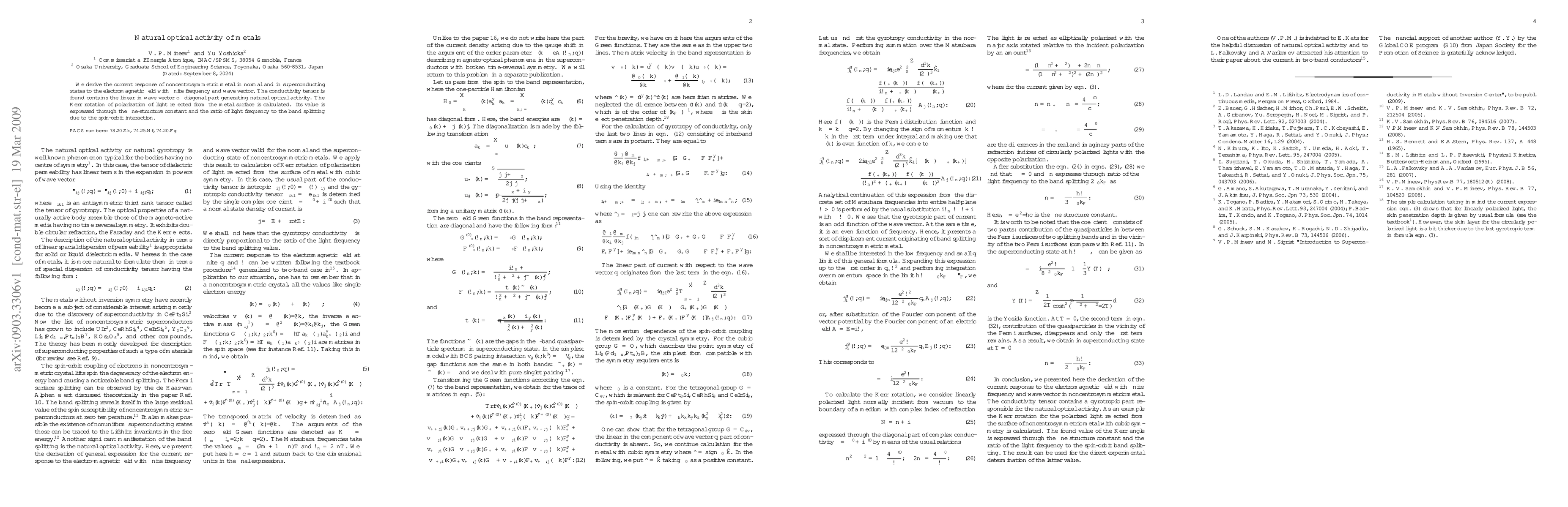 This paper investigates the natural optical activity in noncentrosymmetric metals, revealing that the conductivity tensor includes an off-diagonal component generating this effect. The Kerr rotation of reflected light is calculated and linked to the fine-structure constant and spin-orbit interaction.