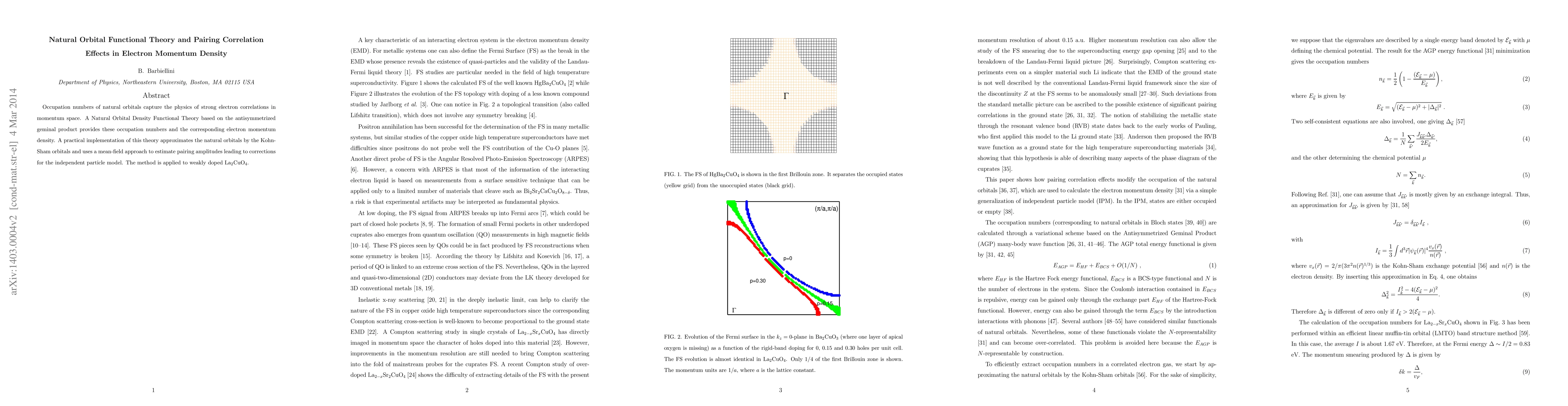 Occupation numbers of natural orbitals capture the physics of strong electron correlations in momentum space. A Natural Orbital Density Functional Theory based on the antisymmetrized geminal product provides these occupation numbers and the corresponding electron momentum density. A practical implementation of this theory approximates the natural orbitals by the Kohn-Sham orbitals and uses a mean-field approach to estimate pairing amplitudes leading to corrections for the independent particle model. The method is applied to weakly doped $\mbox{La$_2$CuO$_4$}$.