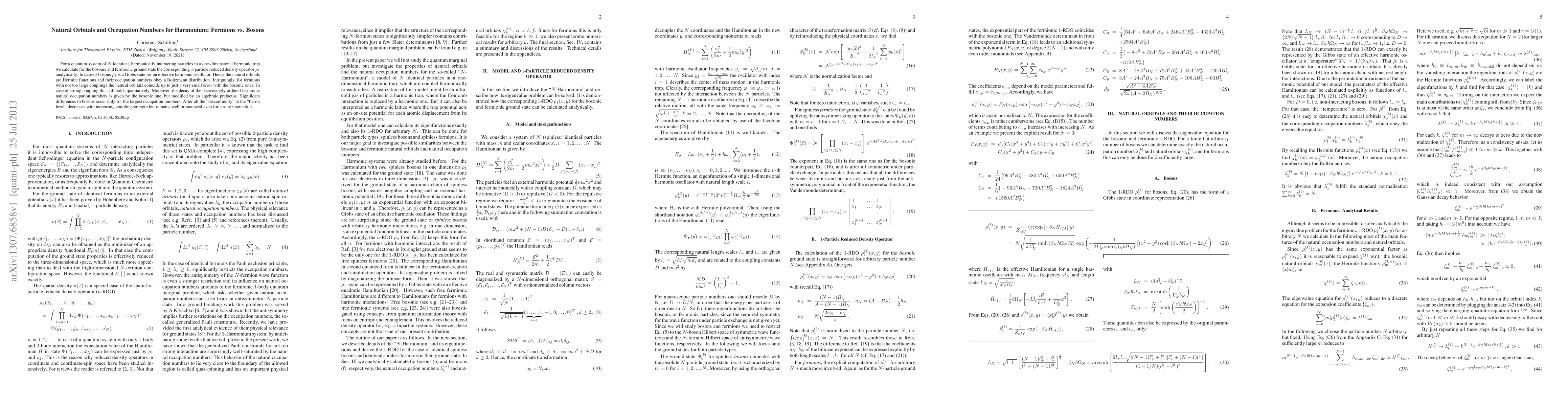 For a quantum system of N identical, harmonically interacting particles in a one-dimensional harmonic trap we calculate for the bosonic and fermionic ground state the corresponding 1-particle reduced density operator $\rho_1$ analytically. In case of bosons $\rho_1$ is a Gibbs state for an effective harmonic oscillator. Hence the natural orbitals are Hermite functions and their occupation numbers obey a Boltzmann distribution. Intriguingly, for fermions with not too large couplings the natural orbitals coincide up to just a very small error with the bosonic ones. In case of strong coupling this still holds qualitatively. Moreover, the decay of the decreasingly ordered fermionic natural occupation numbers is given by the bosonic one, but modified by an algebraic prefactor. Significant differences to bosons occur only for the largest occupation numbers. After all the "discontinuity" at the "Fermi level" decreases with increasing coupling strength but remains well pronounced even for strong interaction.