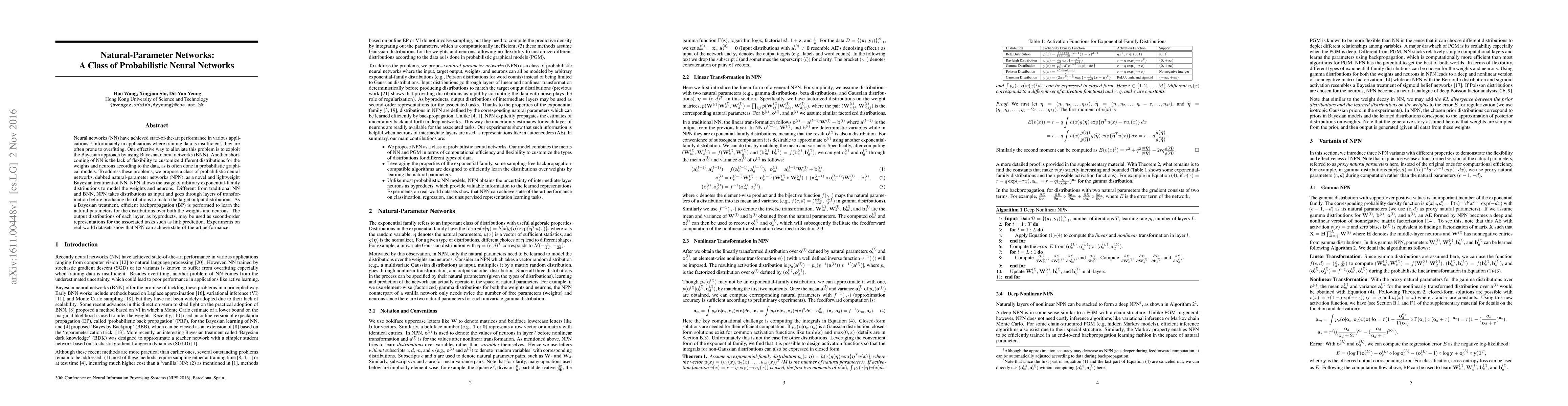 Neural networks (NN) have achieved state-of-the-art performance in various applications. Unfortunately in applications where training data is insufficient, they are often prone to overfitting. One effective way to alleviate this problem is to exploit the Bayesian approach by using Bayesian neural networks (BNN). Another shortcoming of NN is the lack of flexibility to customize different distributions for the weights and neurons according to the data, as is often done in probabilistic graphical models. To address these problems, we propose a class of probabilistic neural networks, dubbed natural-parameter networks (NPN), as a novel and lightweight Bayesian treatment of NN. NPN allows the usage of arbitrary exponential-family distributions to model the weights and neurons. Different from traditional NN and BNN, NPN takes distributions as input and goes through layers of transformation before producing distributions to match the target output distributions. As a Bayesian treatment, efficient backpropagation (BP) is performed to learn the natural parameters for the distributions over both the weights and neurons. The output distributions of each layer, as byproducts, may be used as second-order representations for the associated tasks such as link prediction. Experiments on real-world datasets show that NPN can achieve state-of-the-art performance.