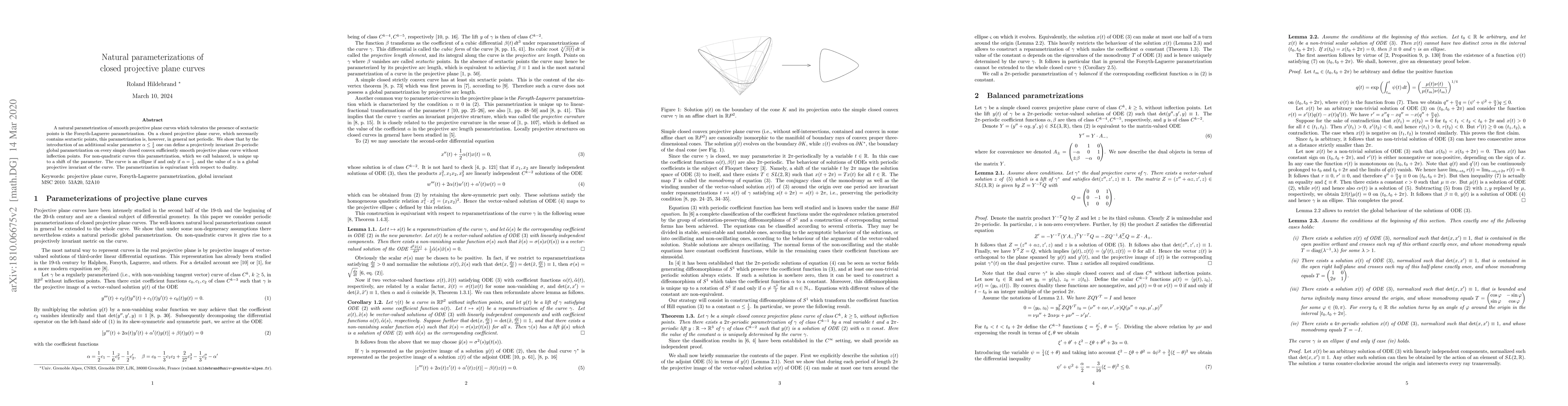 A natural parametrization of smooth projective plane curves which tolerates the presence of sextactic points is the Forsyth-Laguerre parametrization. On a closed projective plane curve, which necessarily contains sextactic points, this parametrization is, however, in general not periodic. We show that by the introduction of an additional scalar parameter $\alpha \leq \frac12$ one can define a projectively invariant $2\pi$-periodic global parametrization on every simple closed convex sufficiently smooth projective plane curve without inflection points. For non-quadratic curves this parametrization, which we call balanced, is unique up to a shift of the parameter. The curve is an ellipse if and only if $\alpha = \frac12$, and the value of $\alpha$ is a global projective invariant of the curve. The parametrization is equivariant with respect to duality.