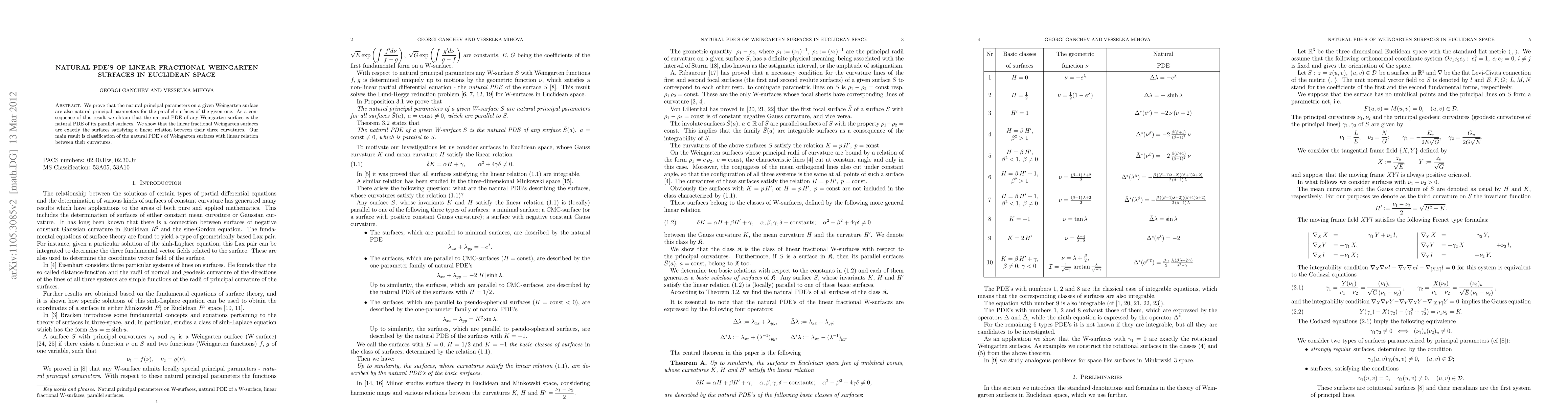 This paper proves that natural principal parameters on a Weingarten surface remain the same for its parallel surfaces, leading to the conclusion that the natural PDEs of such surfaces are identical across parallels. It classifies the natural PDEs of linear fractional Weingarten surfaces, which satisfy a linear relation among their three curvatures.