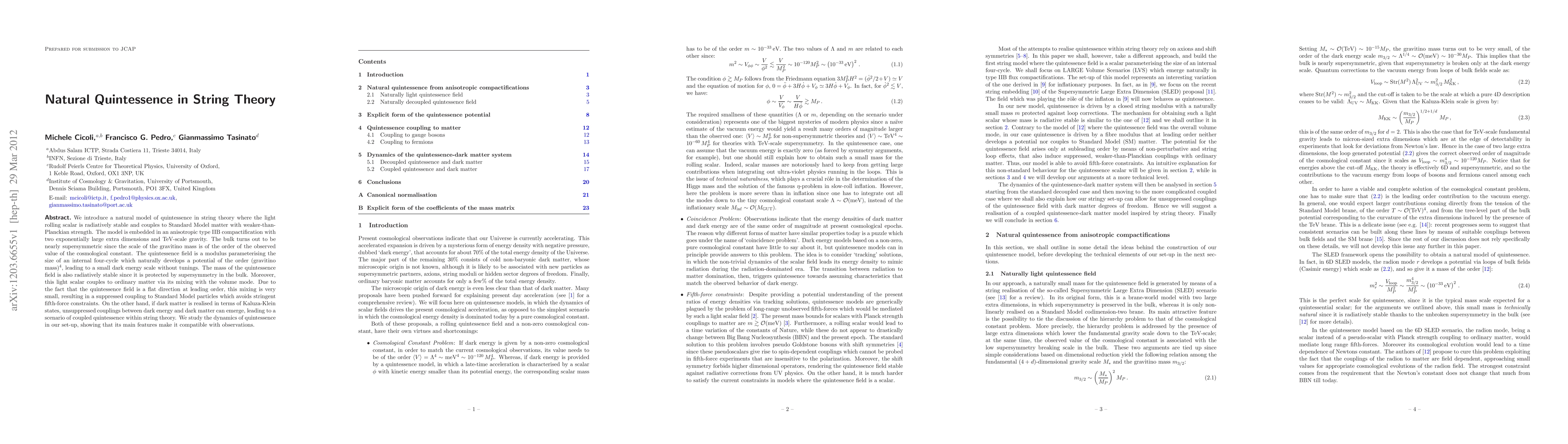 The paper introduces a detailed model of quintessence in string theory, characterized by a radiatively stable, light scalar field with a naturally small dark energy scale, embedded in an anisotropic compactification with TeV-scale gravity.