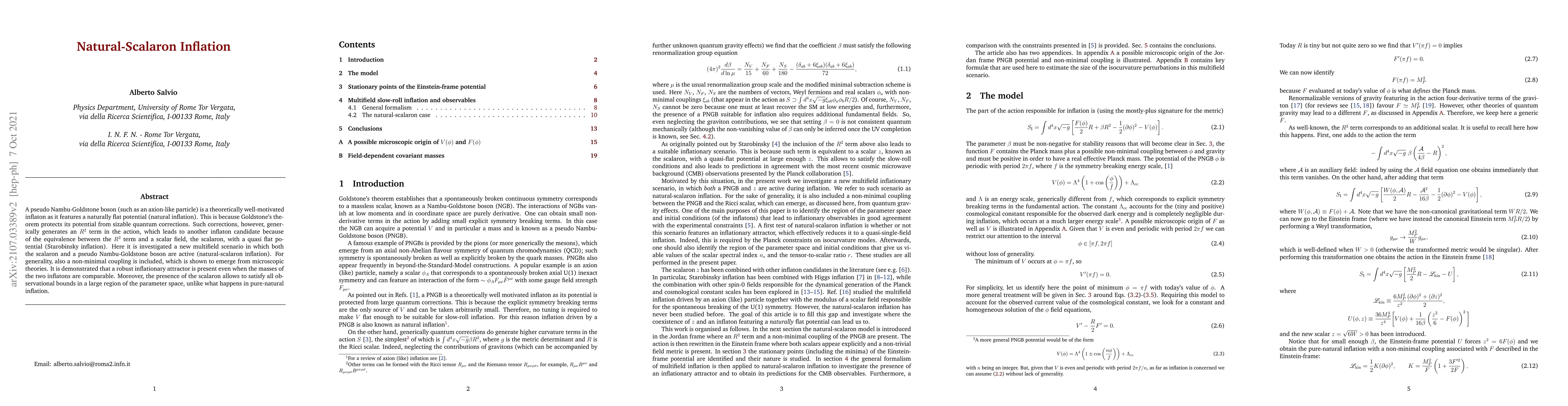 A pseudo Nambu-Goldstone boson (such as an axion-like particle) is a theoretically well-motivated inflaton as it features a naturally flat potential (natural inflation). This is because Goldstone's theorem protects its potential from sizable quantum corrections. Such corrections, however, generically generates an $R^2$ term in the action, which leads to another inflaton candidate because of the equivalence between the $R^2$ term and a scalar field, the scalaron, with a quasi flat potential (Starobinsky inflation). Here it is investigated a new multifield scenario in which both the scalaron and a pseudo Nambu-Goldstone boson are active (natural-scalaron inflation). For generality, also a non-minimal coupling is included, which is shown to emerge from microscopic theories. It is demonstrated that a robust inflationary attractor is present even when the masses of the two inflatons are comparable. Moreover, the presence of the scalaron allows to satisfy all observational bounds in a large region of the parameter space, unlike what happens in pure-natural inflation.