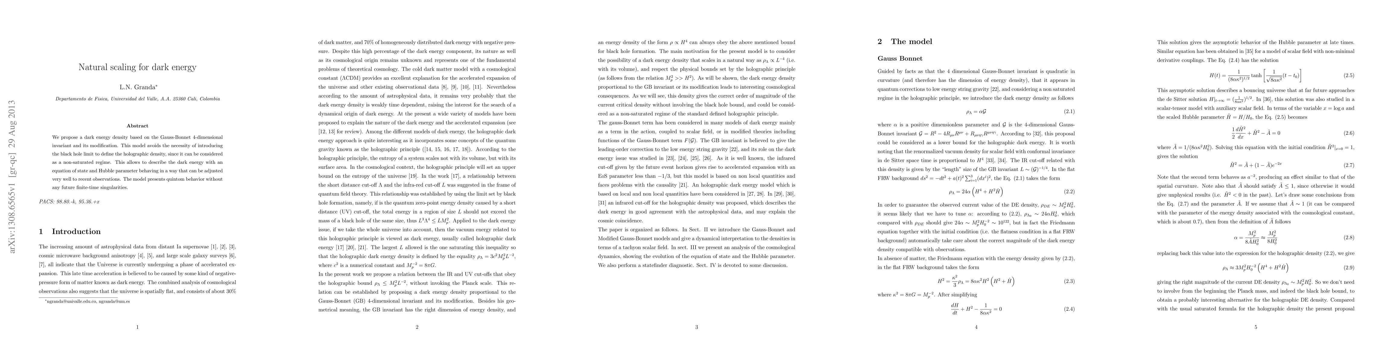 We propose a dark energy density based on the Gauss-Bonnet 4-dimensional invariant and its modification. This model avoids the necessity of introducing the black hole limit to define the holographic density, since it can be considered as a non-saturated regime. This allows to describe the dark energy with an equation of state and Hubble parameter behaving in a way that can be adjusted very well to recent observations. The model presents quintom behavior without any future finite-time singularities.