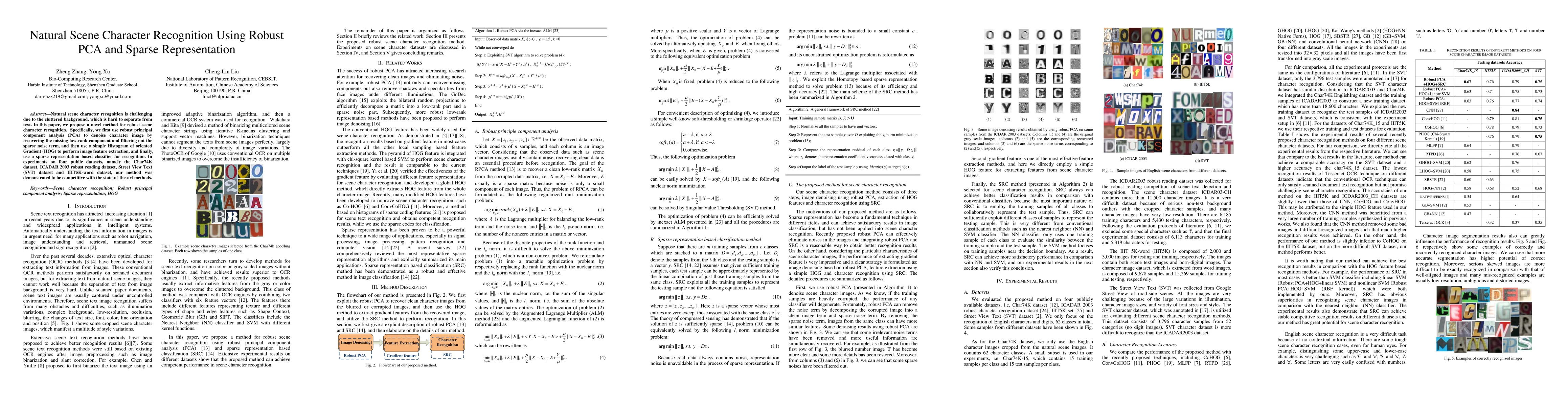 This paper proposes a novel method for robust natural scene character recognition using robust PCA for denoising, HOG for feature extraction, and sparse representation for classification. Experiments on four public datasets show competitive performance against state-of-the-art methods.