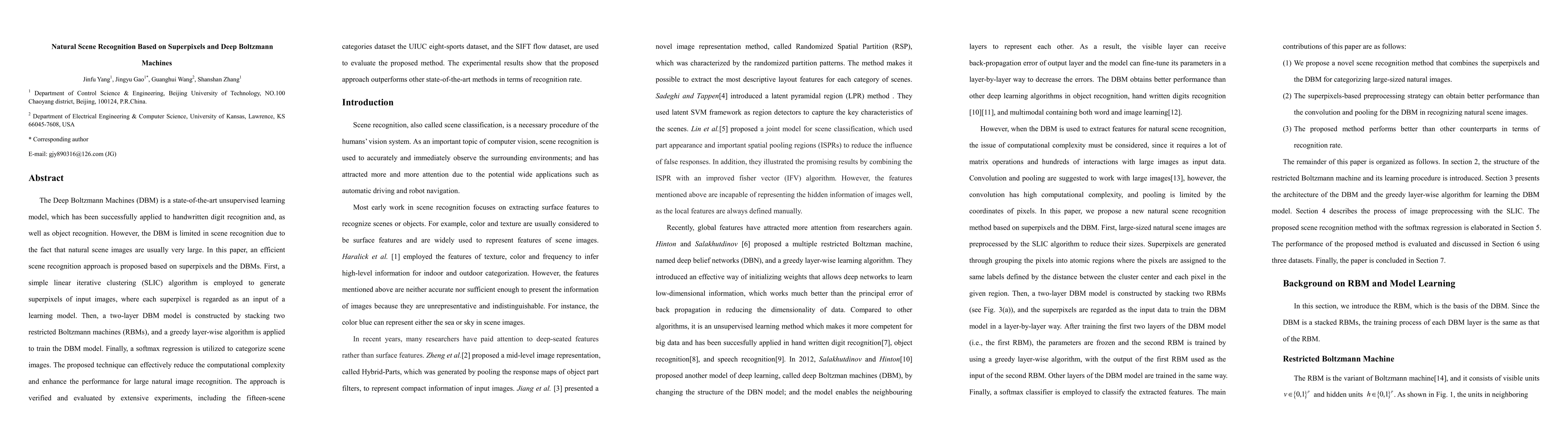 This paper proposes an efficient natural scene recognition method using superpixels and Deep Boltzmann Machines (DBMs). The approach employs superpixels generated via SLIC to reduce computational complexity, then trains a two-layer DBM with RBMs, and uses softmax regression for categorization, achieving superior recognition rates compared to other state-of-the-art methods.