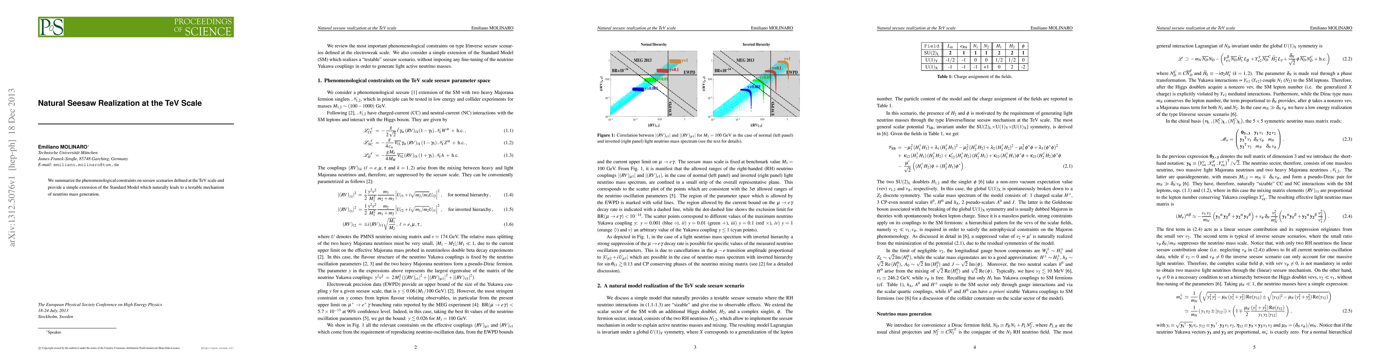 Summary: This paper explores seesaw mechanisms for neutrino mass generation at the TeV scale, presenting a simple extension of the Standard Model that naturally fits within phenomenological constraints and offers a testable mechanism for experimental verification.