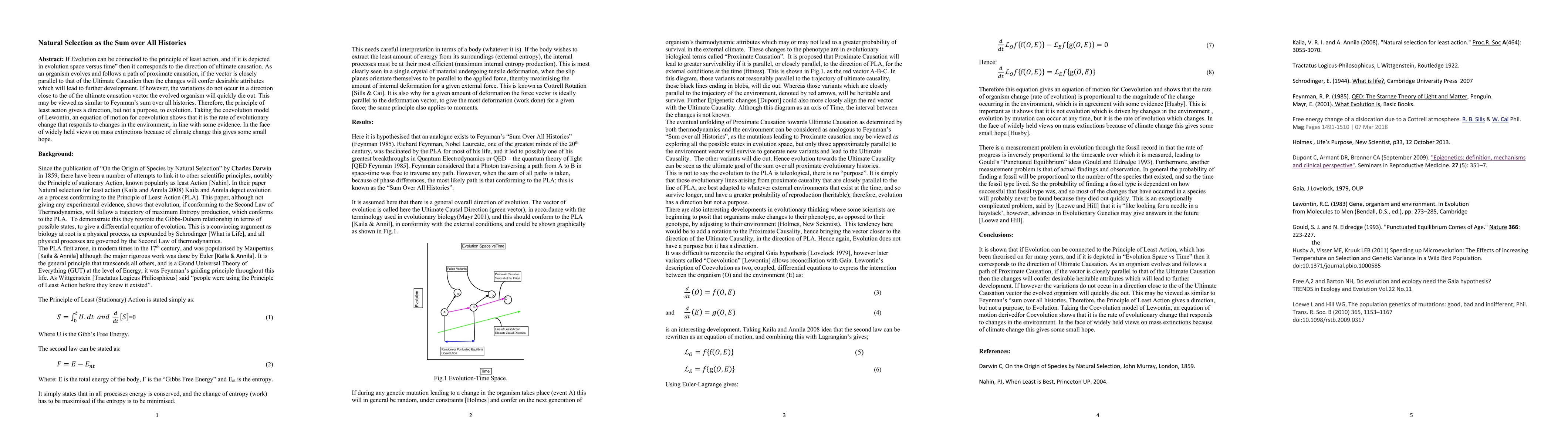 If evolution can be connected to the principle of least action, and if it is depicted in evolution space versus time then it corresponds to the direction of ultimate causation. As an organism evolves and follows a path of proximate causation, if the vector is closely parallel to that of the ultimate causation then the changes will confer desirable attributes which will lead to further development. If however the variations do not occur in a direction close to the of the ultimate causation vector the evolved organism will quickly die out. This may be viewed as similar to Feynmans sum over all histories. Therefore, the principle of least action gives a direction, but not a purpose, to evolution. Taking the coevolution model of Lewontin, an equation of motion for coevolution shows that it is the rate of evolutionary change that responds to changes in the environment, in line with some evidence. In the face of widely held views on mass extinctions because of climate change this gives some small hope.