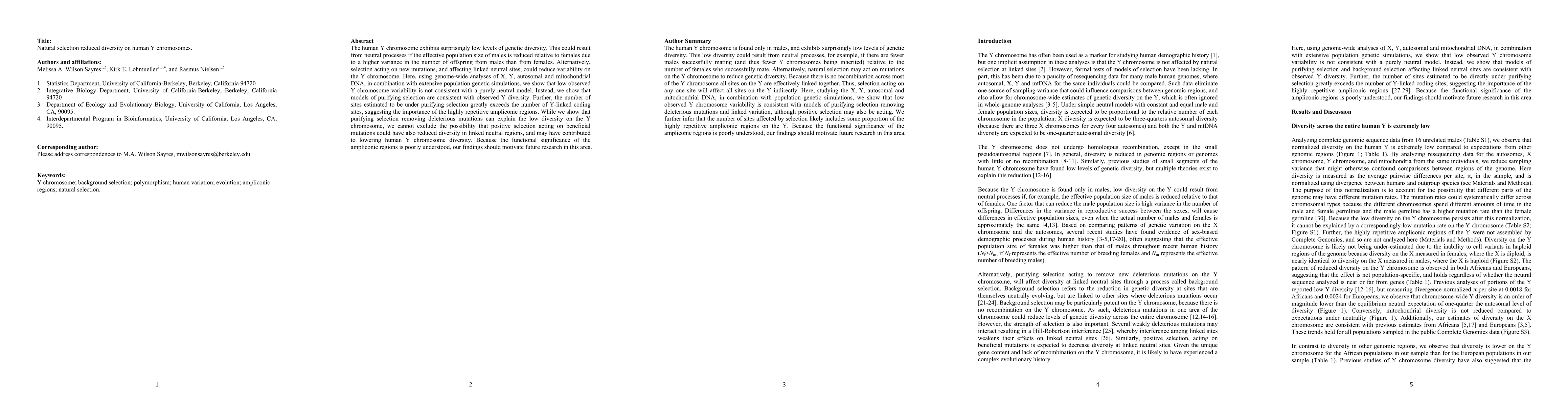 This study finds that low genetic diversity on the human Y chromosome is best explained by purifying selection, rather than neutral processes alone. The analysis suggests that both the removal of deleterious mutations and possibly positive selection for beneficial mutations contribute to the reduced diversity, with the repetitive ampliconic regions playing a significant role.