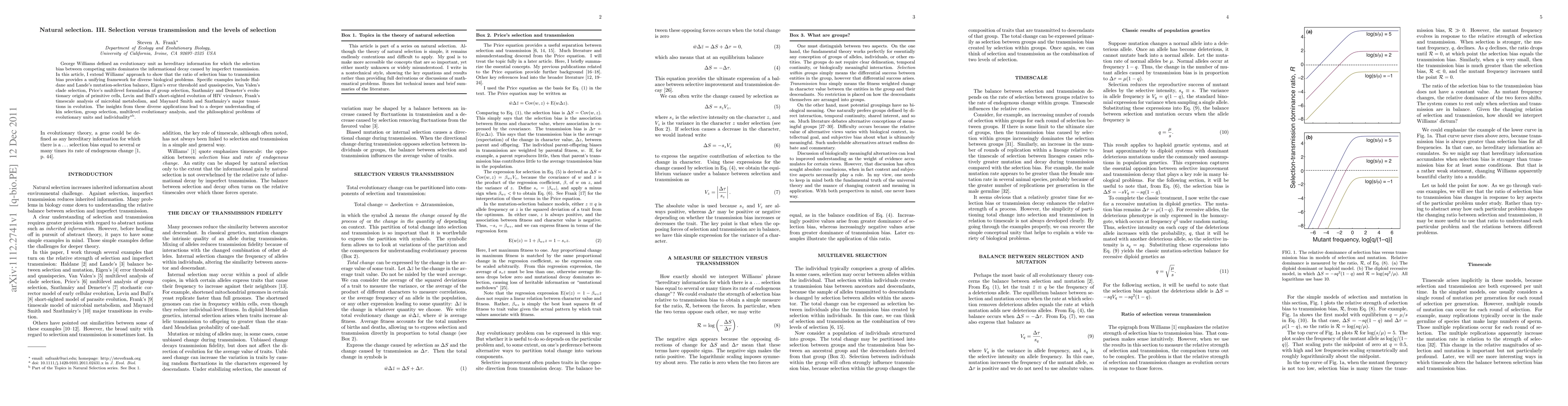 George Williams defined an evolutionary unit as hereditary information for which the selection bias between competing units dominates the informational decay caused by imperfect transmission. In this article, I extend Williams' approach to show that the ratio of selection bias to transmission bias provides a unifying framework for diverse biological problems. Specific examples include Haldane and Lande's mutation-selection balance, Eigen's error threshold and quasispecies, Van Valen's clade selection, Price's multilevel formulation of group selection, Szathmary and Demeter's evolutionary origin of primitive cells, Levin and Bull's short-sighted evolution of HIV virulence, Frank's timescale analysis of microbial metabolism, and Maynard Smith and Szathmary's major transitions in evolution. The insights from these diverse applications lead to a deeper understanding of kin selection, group selection, multilevel evolutionary analysis, and the philosophical problems of evolutionary units and individuality.