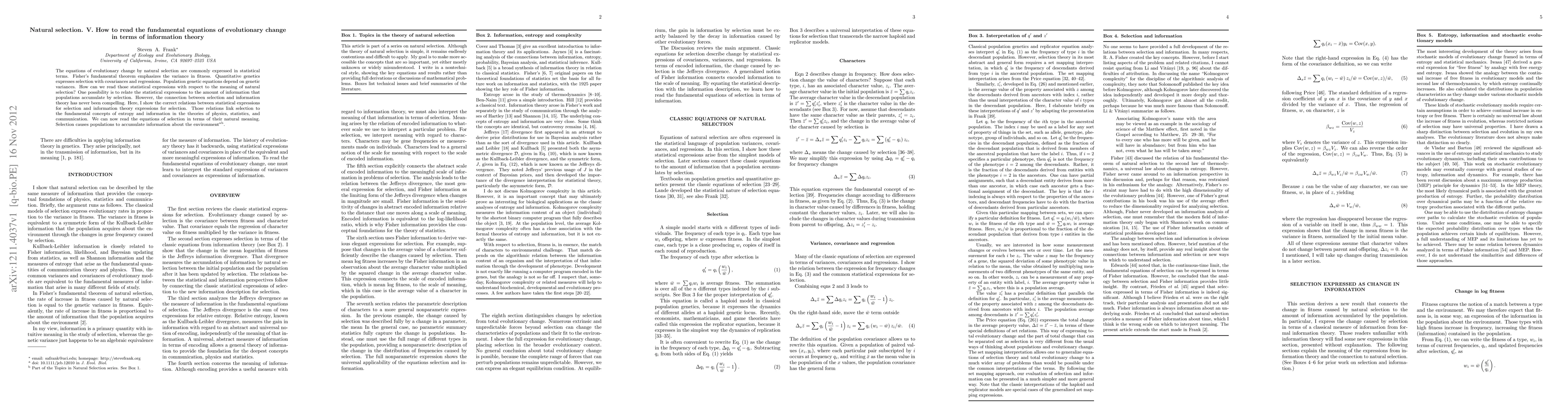 This paper establishes a connection between the statistical equations of evolutionary change and information theory, demonstrating how natural selection can be understood in terms of information accumulation. It reveals the correct relations between these statistical expressions and information theory, linking selection to concepts like entropy and information.