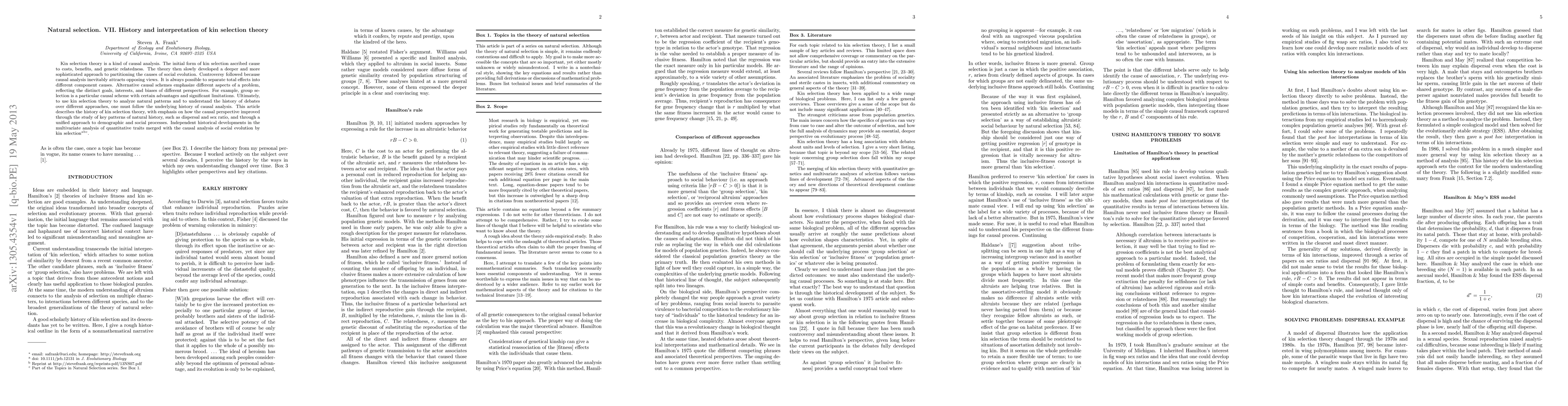Kin selection theory is a kind of causal analysis. The initial form of kin selection ascribed cause to costs, benefits, and genetic relatedness. The theory then slowly developed a deeper and more sophisticated approach to partitioning the causes of social evolution. Controversy followed because causal analysis inevitably attracts opposing views. It is always possible to separate total effects into different component causes. Alternative causal schemes emphasize different aspects of a problem, reflecting the distinct goals, interests, and biases of different perspectives. For example, group selection is a particular causal scheme with certain advantages and significant limitations. Ultimately, to use kin selection theory to analyze natural patterns and to understand the history of debates over different approaches, one must follow the underlying history of causal analysis. This article describes the history of kin selection theory, with emphasis on how the causal perspective improved through the study of key patterns of natural history, such as dispersal and sex ratio, and through a unified approach to demographic and social processes. Independent historical developments in the multivariate analysis of quantitative traits merged with the causal analysis of social evolution by kin selection.