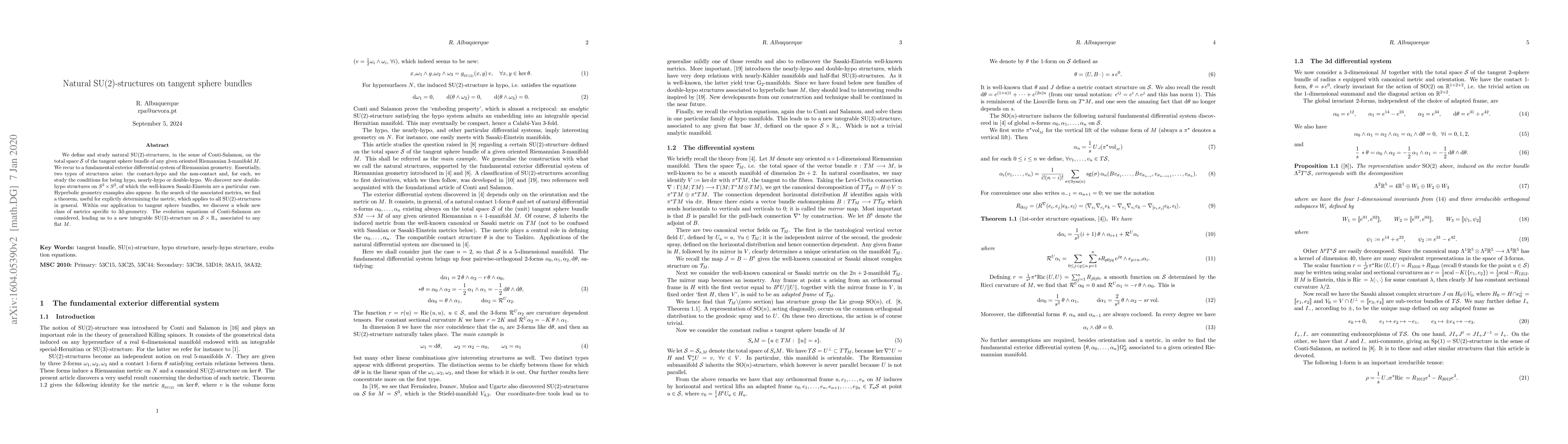 We define and study natural $\mathrm{SU}(2)$-structures, in the sense of Conti-Salamon, on the total space $\cal S$ of the tangent sphere bundle of any given oriented Riemannian 3-manifold $M$. We recur to a fundamental exterior differential system of Riemannian geometry. Essentially, two types of structures arise: the contact-hypo and the non-contact and, for each, we study the conditions for being hypo, nearly-hypo or double-hypo. We discover new double-hypo structures on $S^3\times S^2$, of which the well-known Sasaki-Einstein are a particular case. Hyperbolic geometry examples also appear. In the search of the associated metrics, we find a theorem, useful for explicitly determining the metric, which applies to all $\mathrm{SU}(2)$-structures in general. Within our application to tangent sphere bundles, we discover a whole new class of metrics specific to 3d-geometry. The evolution equations of Conti-Salamon are considered; leading to a new integrable $\mathrm{SU}(3)$-structure on ${\cal S}\times\mathbb{R}_+$ associated to any flat $M$.