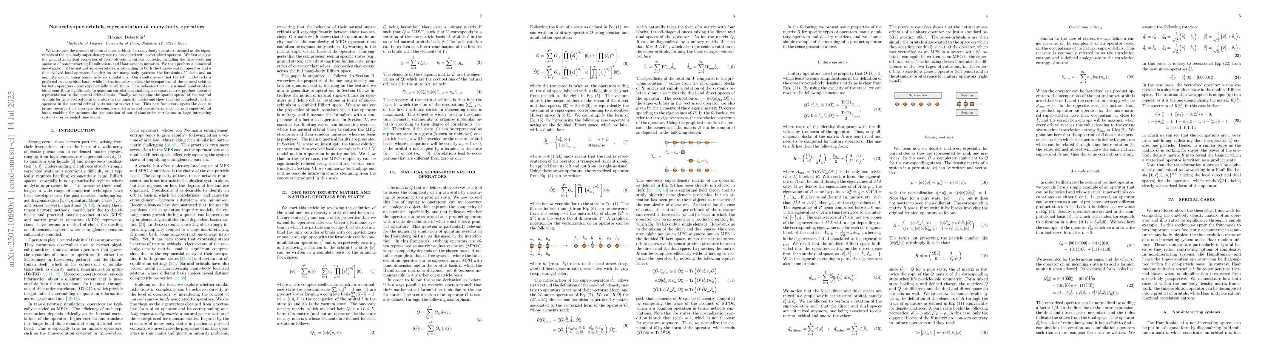We introduce the concept of natural super-orbitals for many-body operators, defined as the eigenvectors of the one-body super-density matrix associated with a vectorized operator. We first analyze the general analytical properties of these objects in various contexts, including the time-evolution operator of non-interacting Hamiltonians and Haar-random unitaries. We then perform a numerical investigation of the natural super-orbitals corresponding to both the time-evolution operator and a time-evolved local operator, focusing on two many-body systems: the fermionic $t\text{-}V$ chain and an impurity model, using tensor network simulations. Our results reveal that the $t\text{-}V$ model lacks a preferred super-orbital basis, while in the impurity model, the occupations of the natural orbitals for both operators decay exponentially at all times. This indicates that only a small number of orbitals contribute significantly to quantum correlations, enabling a compact matrix-product-operator representation in the natural orbital basis. Finally, we examine the spatial spread of the natural orbitals for time-evolved local operators in the impurity model and show that the complexity of this operator in the natural orbital basis saturates over time. This new framework opens the door to future research that leverages the compressed structure of operators in their natural super-orbital basis, enabling for instance the computation of out-of-time-order correlators in large interacting systems over extended time scales.