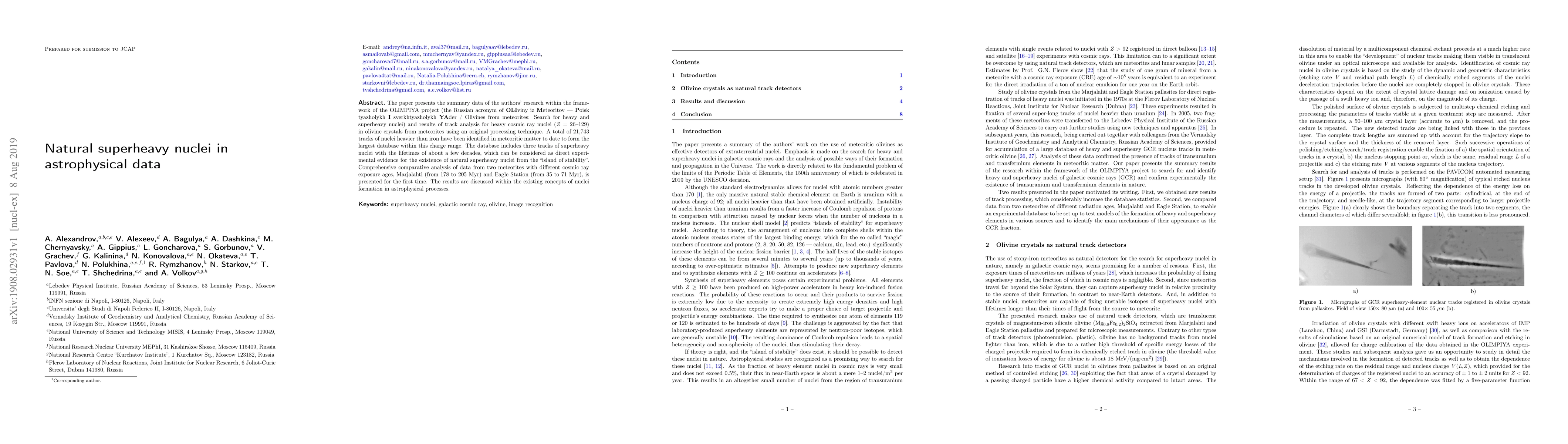 The paper presents the summary data of the authors' research within the framework of the OLIMPIYA project (the Russian acronym of {\bf OLI}viny iz {\bf M}eteoritov --- {\bf P}oisk tyazholykh {\bf I} sverkhtyazholykh {\bf YA}der / Olivines from meteorites: Search for heavy and superheavy nuclei) and results of track analysis for heavy cosmic ray nuclei (\emph{Z} = 26--129) in olivine crystals from meteorites using an original processing technique. A total of 21,743 tracks of nuclei heavier than iron have been identified in meteoritic matter to date to form the largest database within this charge range. The database includes three tracks of superheavy nuclei with the lifetimes of about a few decades, which can be considered as direct experimental evidence for the existence of natural superheavy nuclei from the "island of stability". Comprehensive comparative analysis of data from two meteorites with different cosmic ray exposure ages, Marjalahti (from 178 to 205 Myr) and Eagle Station (from 35 to 71 Myr), is presented for the first time. The results are discussed within the existing concepts of nuclei formation in astrophysical processes.