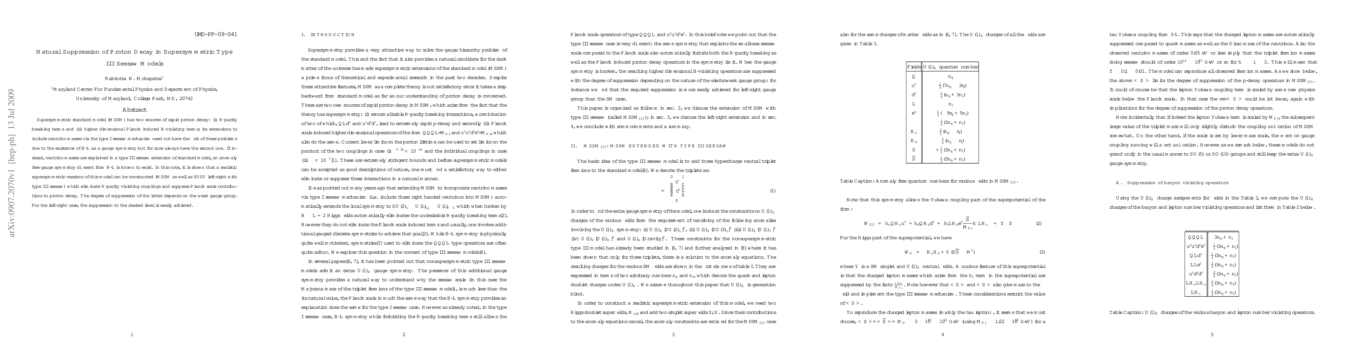 Supersymmetric standard model (MSSM) has two sources of rapid proton decay: (i) R-parity breaking terms and (ii) higher dimensional Planck induced B-violating terms; its extensions to include neutrino masses via the type I seesaw mechanism need not have the first of these problems due to the existence of B-L as a gauge symmetry but for sure always have the second one. If instead, neutrino masses are explained in a type III seesaw extension of the standard model, an anomaly free gauge symmetry different from B-L is known to exist. In this note, it is shown that a realistic supersymmetric versions of this model can be constructed (MSSM as well as SUSY left-right with type III seesaw) which forbid the R-parity violating couplings of MSSM and suppress Planck scale contributions to proton decay. The degree of suppression of the latter depends on the weak gauge group. For the left-right case, the suppression to the desired level is easily achieved.