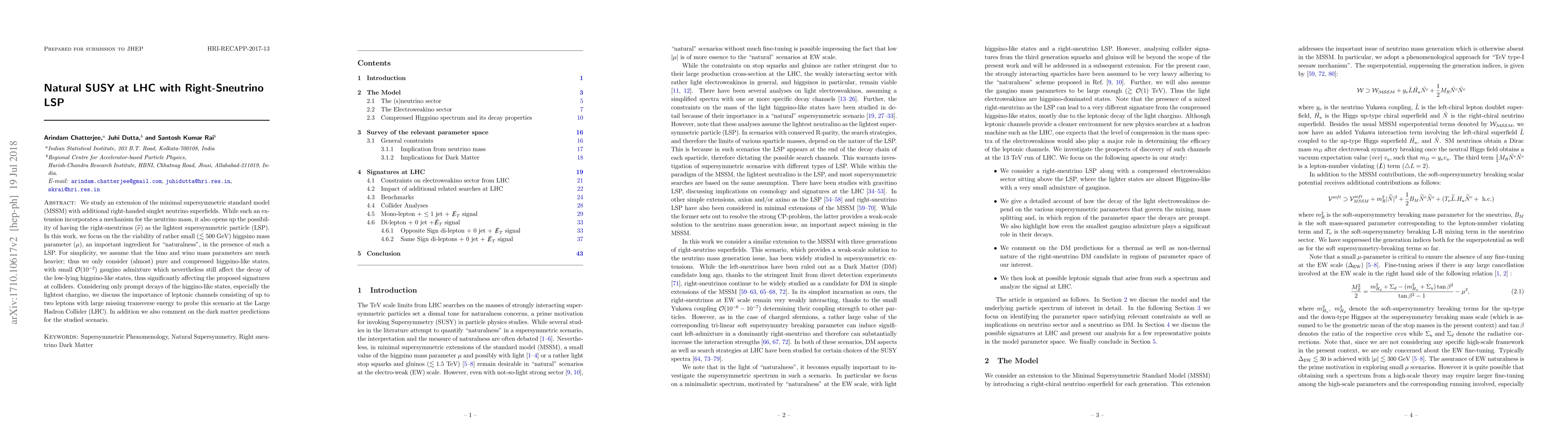We study an extension of the minimal supersymmetric standard model (MSSM) with additional right-handed singlet neutrino superfields. While such an extension incorporates a mechanism for the neutrino mass, it also opens up the possibility of having the right-sneutrinos ($\widetilde{\nu}$) as the lightest supersymmetric particle (LSP). In this work, we focus on the the viability of rather small ($\lesssim 500$ GeV) higgsino mass parameter ($\mu$), an important ingredient for "naturalness", in the presence of such a LSP. For simplicity, we assume that the bino and wino mass parameters are much heavier, thus we only consider (almost) pure and compressed higgsino-like states, with small $\mathcal{O}(10^{-2})$ gaugino admixture. Considering only prompt decays of the higgino-like states, especially the lightest chargino, we discuss the importance of leptonic channels consisting of up to two leptons with large missing transverse energy to probe this scenario at the Large Hadron Collider (LHC). Further, we emphasize on how the gaugino mass parameters, although very heavy, affects the decay of the low-lying higgsino-like states, thus significantly affecting the proposed signatures at LHC.
