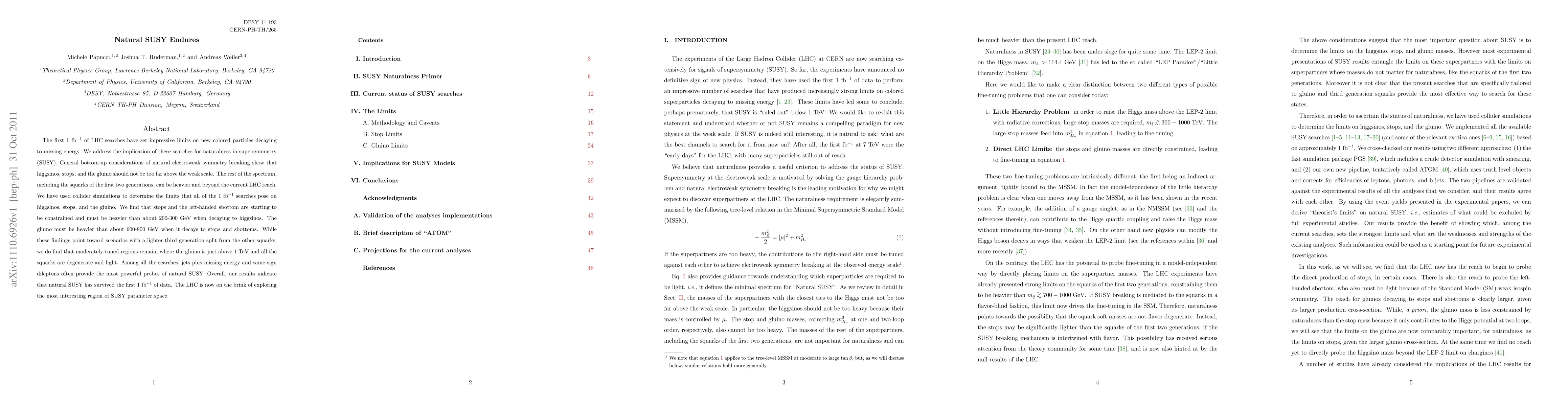 The first 1/fb of LHC searches have set impressive limits on new colored particles decaying to missing energy. We address the implication of these searches for naturalness in supersymmetry (SUSY). General bottom-up considerations of natural electroweak symmetry breaking show that higgsinos, stops, and the gluino should not be too far above the weak scale. The rest of the spectrum, including the squarks of the first two generations, can be heavier and beyond the current LHC reach. We have used collider simulations to determine the limits that all of the 1/fb searches pose on higgsinos, stops, and the gluino. We find that stops and the left-handed sbottom are starting to be constrained and must be heavier than about 200-300 GeV when decaying to higgsinos. The gluino must be heavier than about 600-800 GeV when it decays to stops and sbottoms. While these findings point toward scenarios with a lighter third generation split from the other squarks, we do find that moderately-tuned regions remain, where the gluino is just above 1 TeV and all the squarks are degenerate and light. Among all the searches, jets plus missing energy and same-sign dileptons often provide the most powerful probes of natural SUSY. Overall, our results indicate that natural SUSY has survived the first 1/fb of data. The LHC is now on the brink of exploring the most interesting region of SUSY parameter space.
