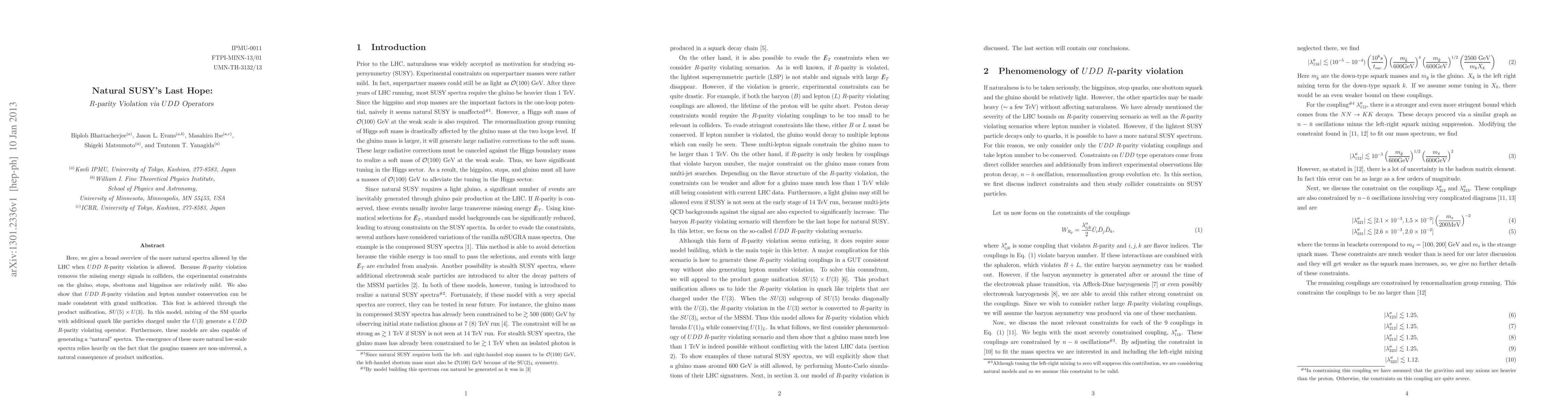 Here, we give a broad overview of the more natural spectra allowed by the LHC when UDD R-parity violation is allowed. Because R-parity violation removes the missing energy signals in colliders, the experimental constraints on the gluino, stops, sbottoms and higgsinos are relatively mild. We also show that UDD R-parity violation and lepton number conservation can be made consistent with grand unification. This feat is achieved through the product unification, SU(5) X U(3). In this model, mixing of the SM quarks with additional quark like particles charged under the U(3) generate a UDD R-parity violating operator. Furthermore, these models are also capable of generating a "natural" spectra. The emergence of these more natural low-scale spectra relies heavily on the fact that the gaugino masses are non-universal, a natural consequence of product unification.