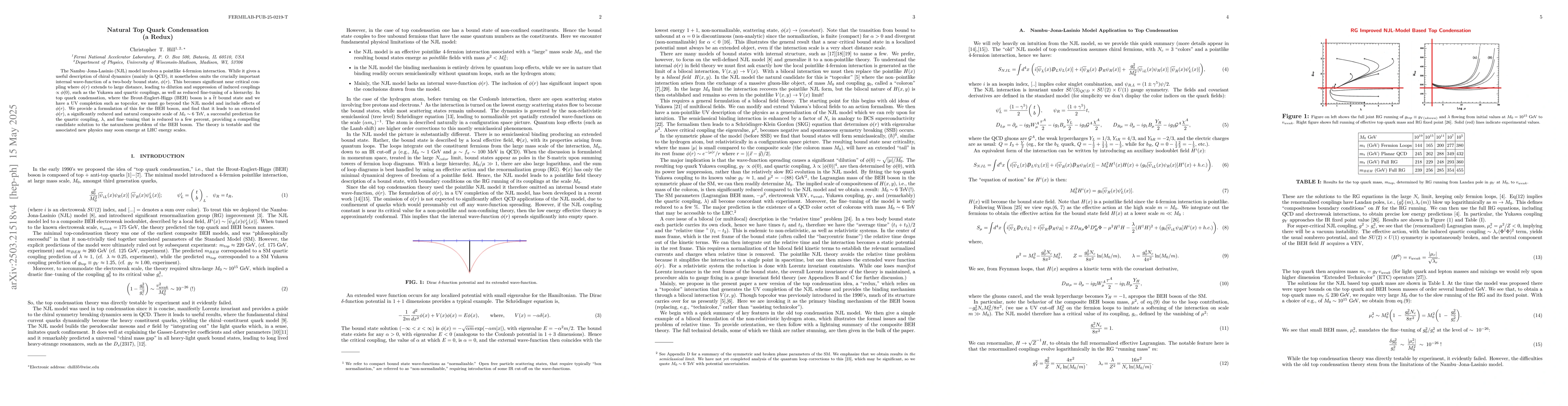 The Nambu--Jona-Lasinio (NJL) model involves a pointlike 4-fermion interaction. While it gives a useful description of chiral dynamics (mainly in QCD), it nonetheless omits the crucially important internal wave-function of a two-body bound state, $\phi(r)$. This becomes significant near critical coupling where $\phi(r)$ extends to large distance, leading to dilution and suppression of induced couplings $\propto \phi(0)$, such as the Yukawa and quartic couplings, as well as reduced fine-tuning of a hierarchy. In top quark condensation, where the BEH boson is a $\bar{t}t$ bound state and we have a UV completion such as topcolor, we must go beyond the NJL model and include effects of $\phi(r)$. We provide a formulation of this for the Brout-Englert-Higgs boson, and find that it leads to an extended $\phi(r)$, a significantly reduced and natural composite scale of $M_0 \sim 6$ TeV, a successful prediction for the quartic coupling, $\lambda$, and fine tuning that is reduced to a few percent, providing a compelling candidate solution to the naturalness problem of the BEH boson. The theory is testable and new physics should begin to emerge on the multi-TeV mass scales and possibly accessible to the LHC.