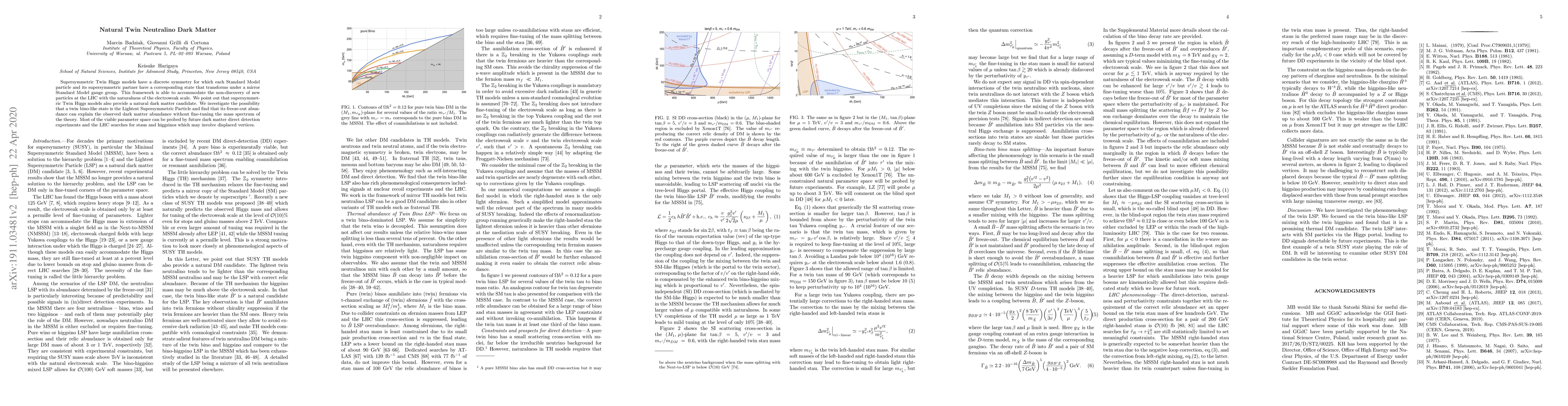 This paper explores supersymmetric Twin Higgs models, suggesting that a twin bino-like neutralino can naturally serve as dark matter. It finds that this candidate can match observed dark matter abundances without requiring fine-tuning, and highlights potential future detection prospects via dark matter experiments and LHC searches.