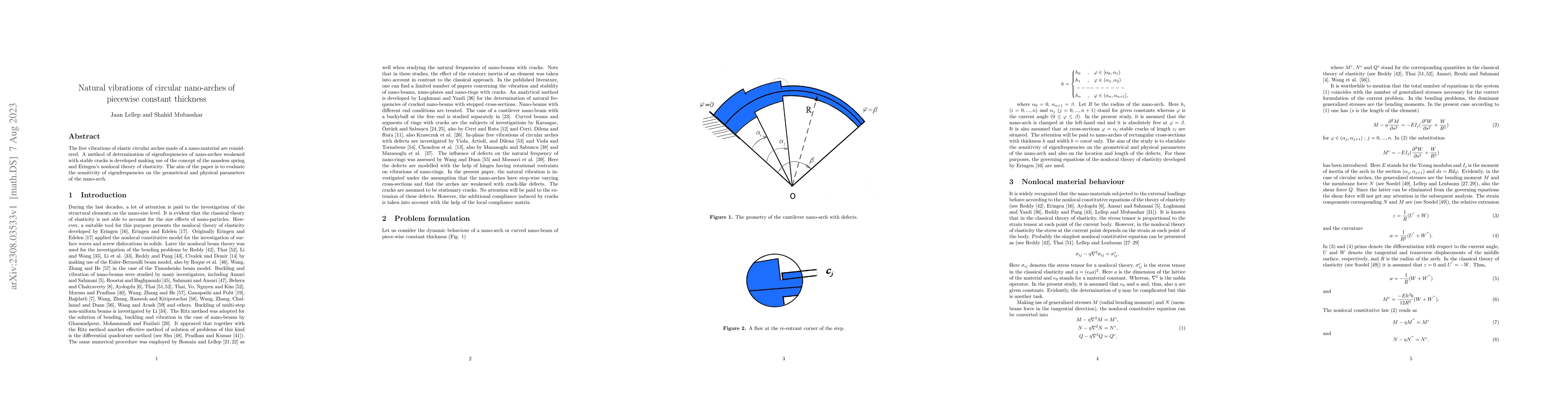 The free vibrations of elastic circular arches made of a nano-material are considered. A method of determination of eigenfrequencies of nano-arches weakened with stable cracks is developed making use of the concept of the massless spring and Eringen's nonlocal theory of elasticity. The aim of the paper is to evaluate the sensitivity of eigenfrequencies on the geometrical and physical parameters of the nano-arch.