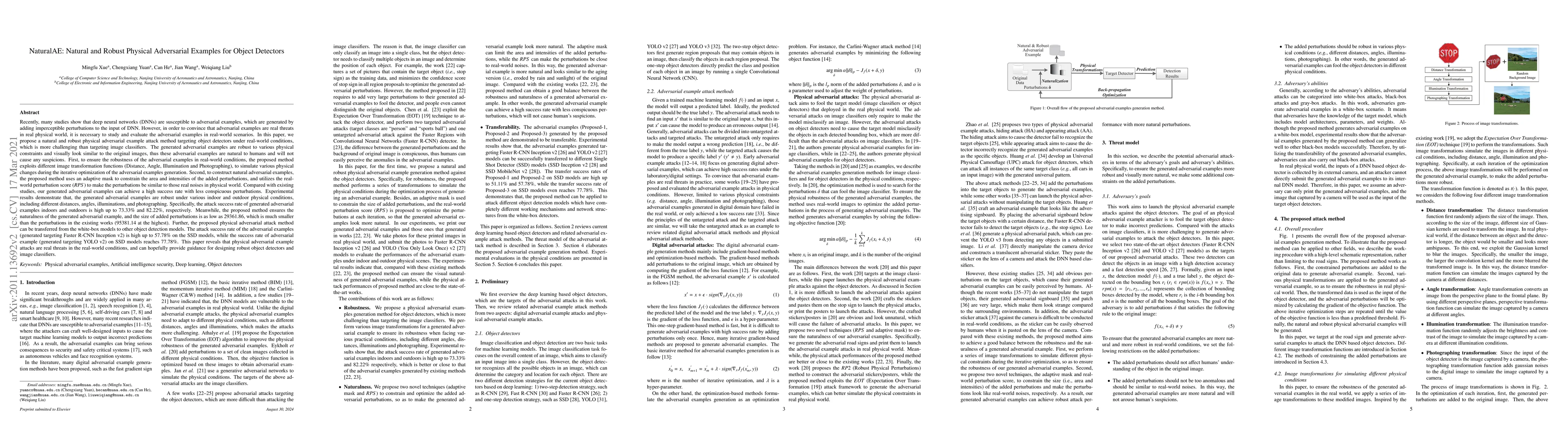 This paper introduces a method for creating natural and robust physical adversarial examples that can deceive object detectors under real-world conditions. The proposed approach generates subtle perturbations that remain effective across various physical constraints, achieving high attack success rates while maintaining visual similarity to the original images.