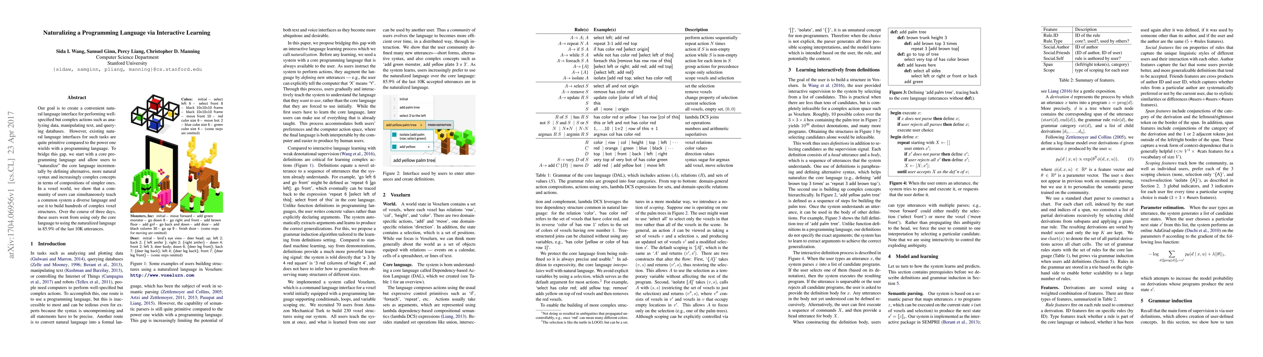 Our goal is to create a convenient natural language interface for performing well-specified but complex actions such as analyzing data, manipulating text, and querying databases. However, existing natural language interfaces for such tasks are quite primitive compared to the power one wields with a programming language. To bridge this gap, we start with a core programming language and allow users to "naturalize" the core language incrementally by defining alternative, more natural syntax and increasingly complex concepts in terms of compositions of simpler ones. In a voxel world, we show that a community of users can simultaneously teach a common system a diverse language and use it to build hundreds of complex voxel structures. Over the course of three days, these users went from using only the core language to using the naturalized language in 85.9\% of the last 10K utterances.