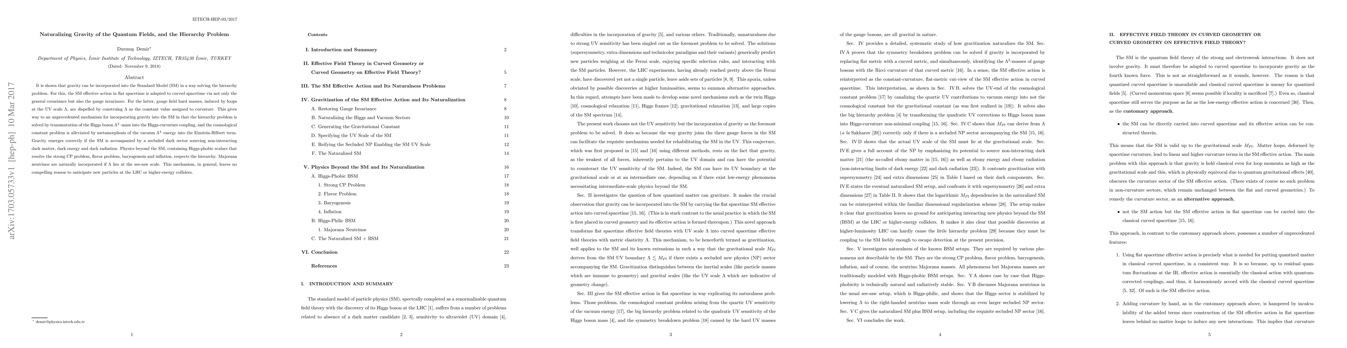 It is shown that gravity can be incorporated into the Standard Model (SM) in a way solving the hierarchy problem. For this, the SM effective action in flat spacetime is adapted to curved spacetime via not only the general covariance but also the gauge invariance. For the latter, gauge field hard masses, induced by loops at the UV scale $\Lambda$, are dispelled by construing $\Lambda$ as the constant value assigned to curvature. This gives way to an unprecedented mechanism for incorporating gravity into the SM in that the hierarchy problem is solved by transmutation of the Higgs boson $\Lambda^2$--mass into the Higgs-curvature coupling, and the cosmological constant problem is alleviated by metamorphosis of the vacuum $\Lambda^4$--energy into the Einstein-Hilbert term. Gravity emerges correctly if the SM is accompanied by a secluded dark sector sourcing non-interacting dark matter, dark energy and dark radiation. Physics beyond the SM, containing Higgs-phobic scalars that resolve the strong CP problem, flavor problem, baryogenesis and inflation, respects the hierarchy. Majorana neutrinos are naturally incorporated if $\Lambda$ lies at the see-saw scale. This mechanism, in general, leaves no compelling reason to anticipate new particles at the LHC or higher-energy colliders.