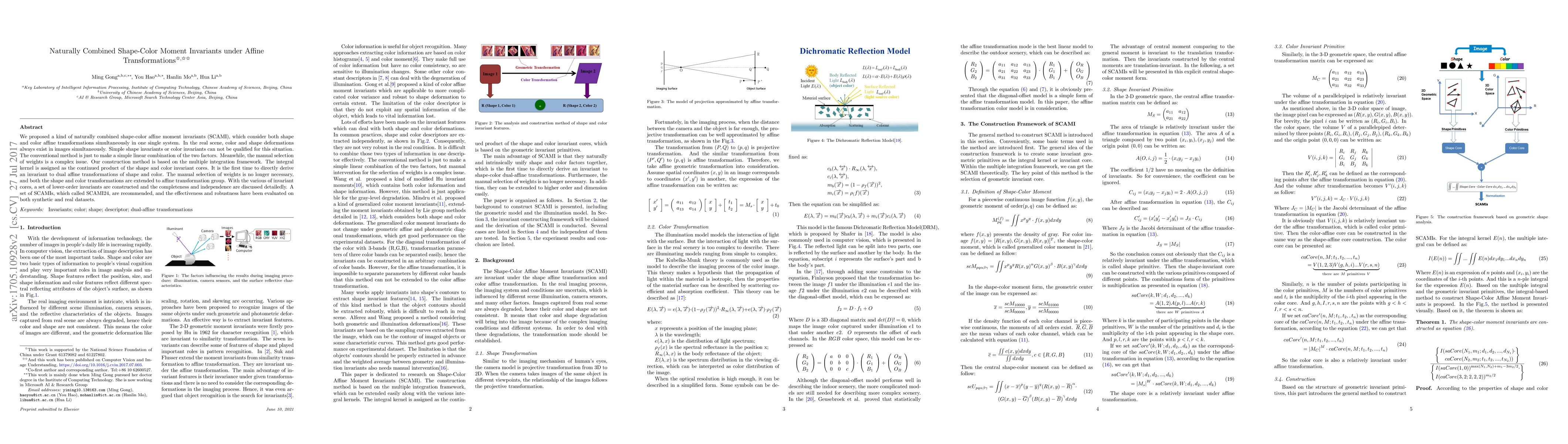 We proposed a kind of naturally combined shape-color affine moment invariants (SCAMI), which consider both shape and color affine transformations simultaneously in one single system. In the real scene, color and shape deformations always exist in images simultaneously. Simple shape invariants or color invariants can not be qualified for this situation. The conventional method is just to make a simple linear combination of the two factors. Meanwhile, the manual selection of weights is a complex issue. Our construction method is based on the multiple integration framework. The integral kernel is assigned as the continued product of the shape and color invariant cores. It is the first time to directly derive an invariant to dual affine transformations of shape and color. The manual selection of weights is no longer necessary, and both the shape and color transformations are extended to affine transformation group. With the various of invariant cores, a set of lower-order invariants are constructed and the completeness and independence are discussed detailedly. A set of SCAMIs, which called SCAMI24, are recommended, and the effectiveness and robustness have been evaluated on both synthetic and real datasets.