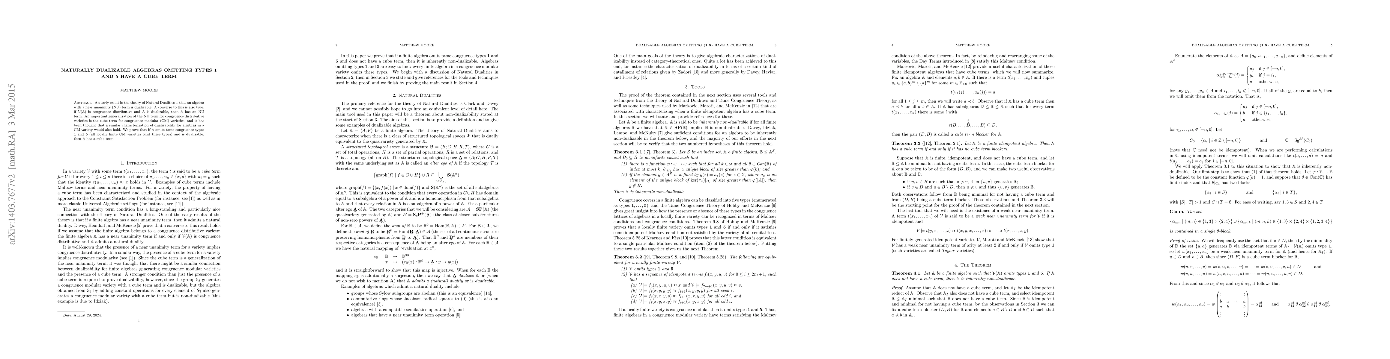 An early result in the theory of Natural Dualities is that an algebra with a near unanimity (NU) term is dualizable. A converse to this is also true: if V(A) is congruence distributive and A is dualizable, then A has an NU term. An important generalization of the NU term for congruence distributive varieties is the cube term for congruence modular (CM) varieties, and it has been thought that a similar characterization of dualizability for algebras in a CM variety would also hold. We prove that if A omits tame congruence types 1 and 5 (all locally finite CM varieties omit these types) and is dualizable, then A has a cube term.