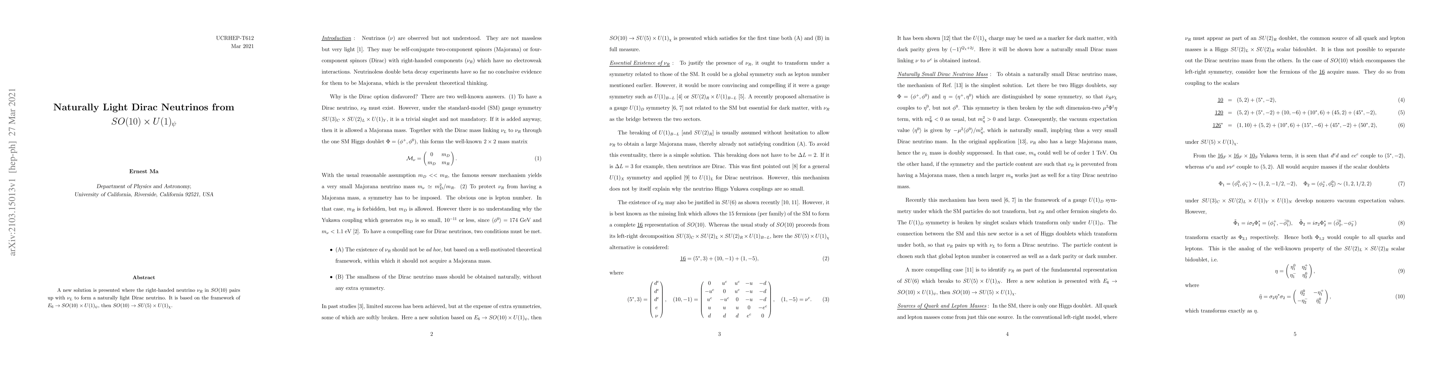 A new solution is presented where the right-handed neutrino $\nu_R$ in $SO(10)$ pairs up with $\nu_L$ to form a naturally light Dirac neutrino. It is based on the framework of $E_6 \to SO(10) \times U(1)_\psi$, then $SO(10) \to SU(5) \times U(1)_\chi$.