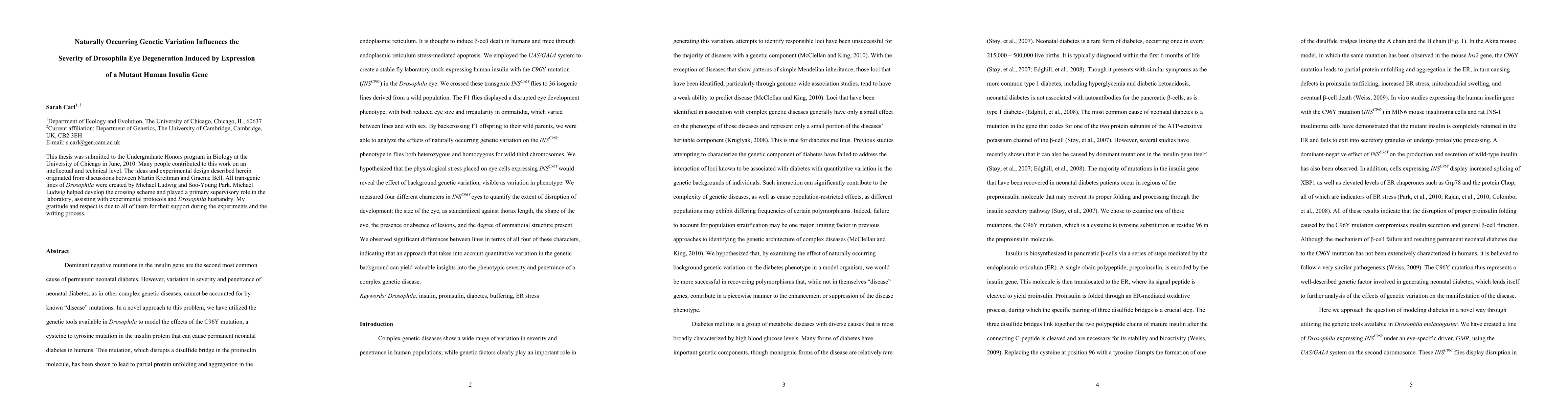 This study uses Drosophila to model the effects of a mutant human insulin gene linked to neonatal diabetes, showing that naturally occurring genetic variation in flies significantly influences the severity of eye degeneration induced by the mutation. The findings suggest that genetic background plays a crucial role in the phenotypic outcomes of complex genetic diseases.