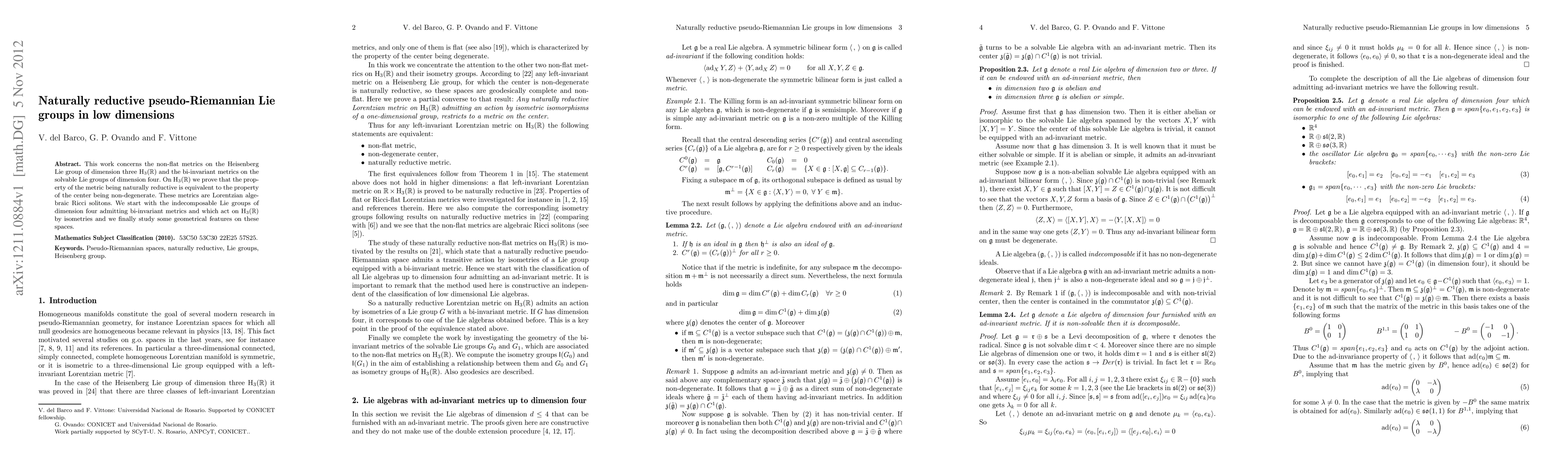 This paper investigates naturally reductive metrics on the three-dimensional Heisenberg Lie group and bi-invariant metrics on four-dimensional solvable Lie groups, proving that naturally reductive metrics on $\Heis_3(\RR)$ have non-degenerate centers. It also explores geometric features of four-dimensional Lie groups acting on $\Heis_3(\RR)$ by isometries.