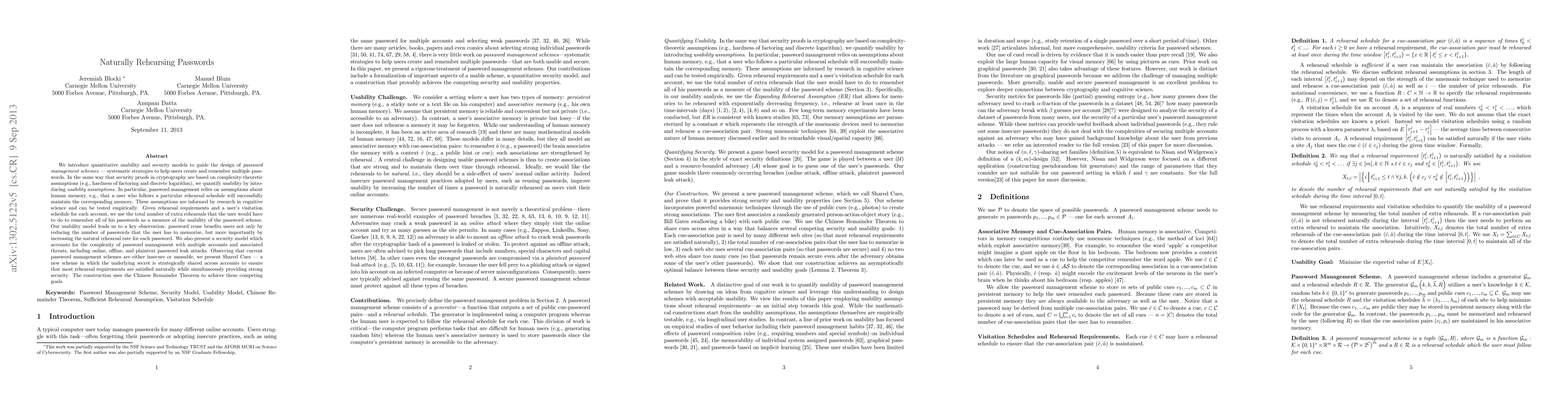 This paper introduces usability and security models to guide the design of password management schemes, emphasizing the importance of natural rehearsal in enhancing memory. It proposes Shared Cues, a new scheme that leverages the Chinese Remainder Theorem to balance usability and security by strategically sharing secrets across accounts.