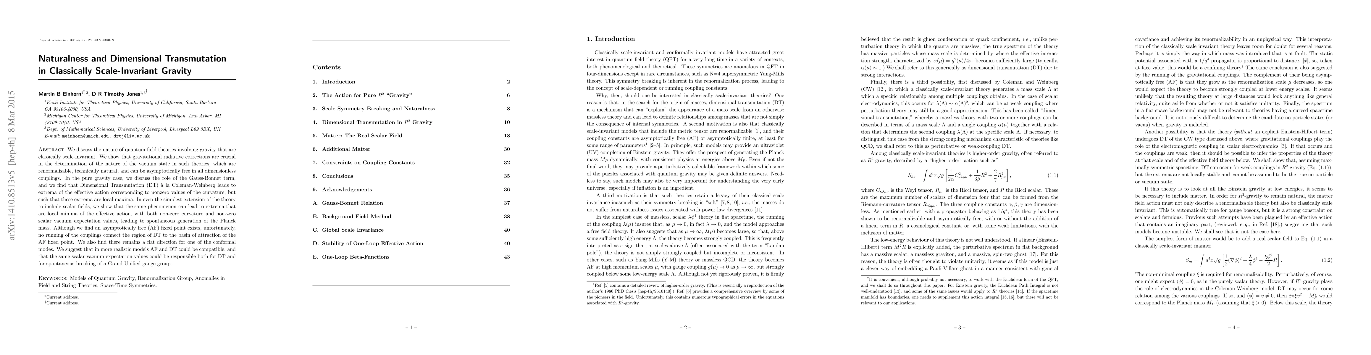 We discuss the nature of quantum field theories involving gravity that are classically scale-invariant. We show that gravitational radiative corrections are crucial in the determination of the nature of the vacuum state in such theories, which are renormalisable, technically natural, and can be asymptotically free in all dimensionless couplings. In the pure gravity case, we discuss the role of the Gauss-Bonnet term, and we find that Dimensional Transmutation (DT) \`a la Coleman-Weinberg leads to extrema of the effective action corresponding to nonzero values of the curvature, but such that these extrema are local maxima. In even the simplest extension of the theory to include scalar fields, we show that the same phenomenon can lead to extrema that are local minima of the effective action, with both non-zero curvature and non-zero scalar vacuum expectation values, leading to spontaneous generation of the Planck mass. Although we find an asymptotically free (AF) fixed point exists, unfortunately, no running of the couplings connect the region of DT to the basin of attraction of the AF fixed point. We also find there remains a flat direction for one of the conformal modes. We suggest that in more realistic models AF and DT could be compatible, and that the same scalar vacuum expectation values could be responsible both for DT and for spontaneous breaking of a Grand Unified gauge group.