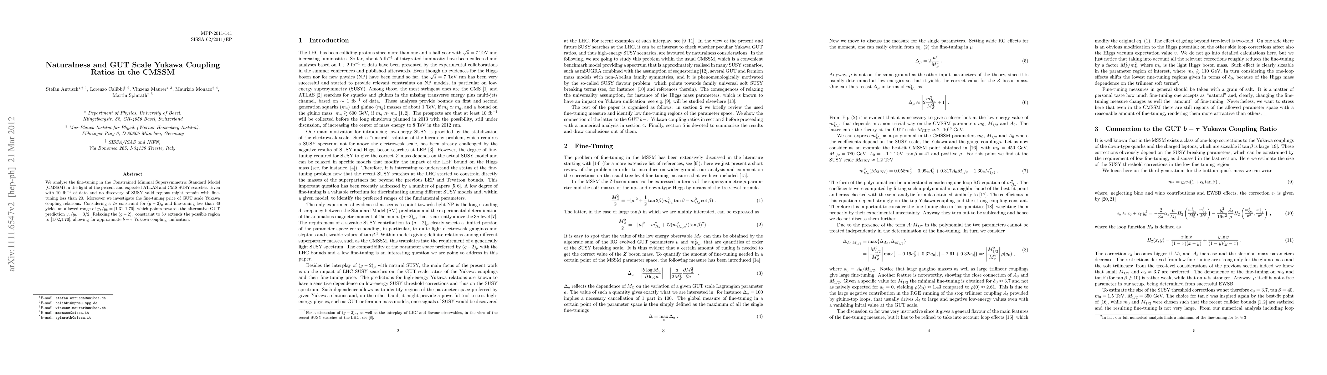 We analyse the fine-tuning in the Constrained Minimal Supersymmetric Standard Model (CMSSM) in the light of the present and expected ATLAS and CMS SUSY searches. Even with 10/fb of data and no discovery of SUSY valid regions might remain with fine-tuning less than 20. Moreover we investigate the fine-tuning price of GUT scale Yukawa coupling relations. Considering a 2$\sigma$ constraint for $(g-2)_\mu$ and fine-tuning less than 30 yields an allowed range of $y_\tau/y_b = [1.31,1.70]$, which points towards the alternative GUT prediction $y_\tau/y_b = 3/2$. Relaxing the $(g-2)_\mu$ constraint to 5$\sigma$ extends the possible region to [1.02,1.70], allowing for approximate $b-\tau$ Yukawa coupling unification.