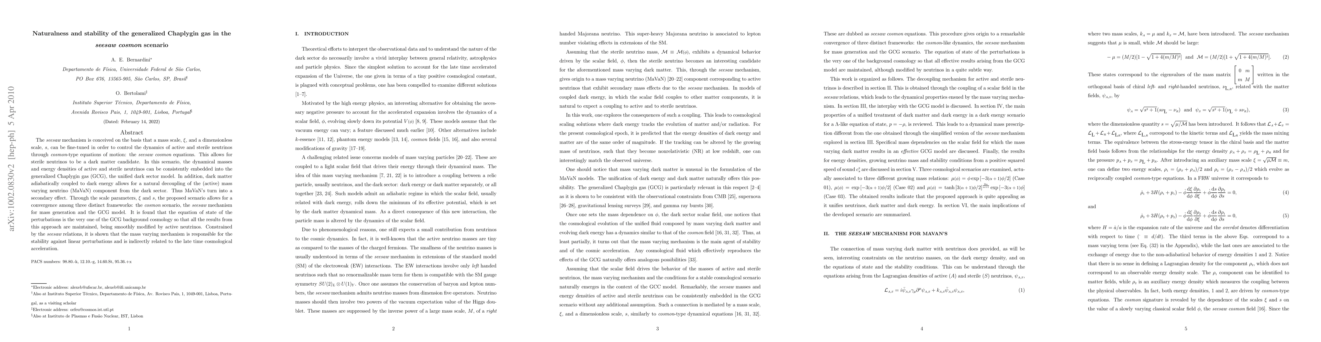 This paper explores the naturalness and stability of the generalized Chaplygin gas within the seesaw cosmon scenario, demonstrating how fine-tuned mass and dimensionless scales can control neutrino dynamics. The study shows that the seesaw mechanism allows sterile neutrinos to serve as dark matter candidates and integrates them into the GCG model, maintaining stability and late-time cosmological acceleration.