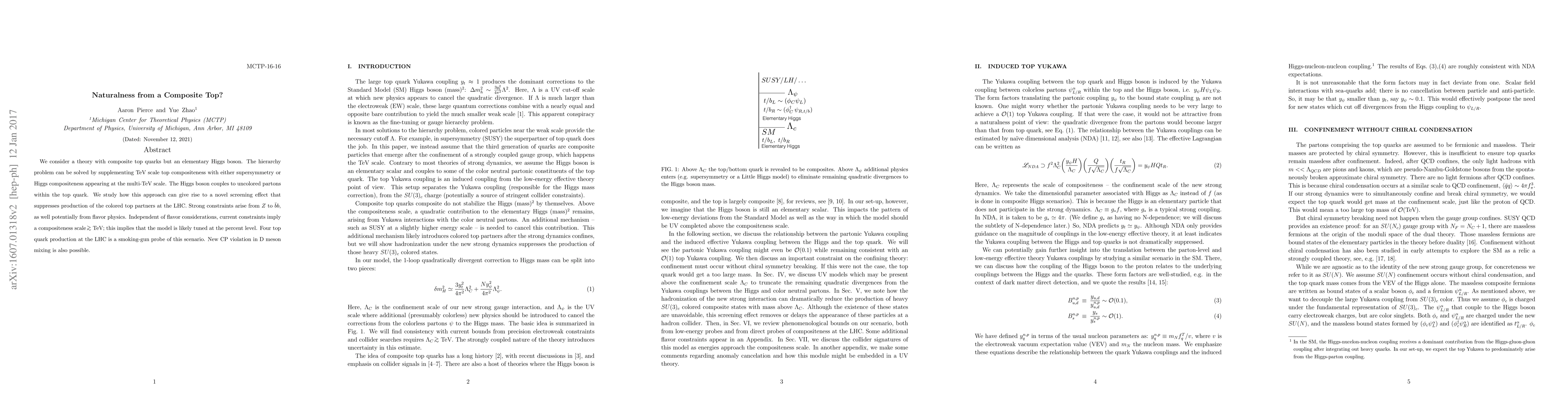We consider a theory with composite top quarks but an elementary Higgs boson. The hierarchy problem can be solved by supplementing TeV scale top compositeness with either supersymmetry or Higgs compositeness appearing at the multi-TeV scale. The Higgs boson couples to uncolored partons within the top quark. We study how this approach can give rise to a novel screening effect that suppresses production of the colored top partners at the LHC. Strong constraints arise from Z to bb, as well potentially from flavor physics. Independent of flavor considerations, current constraints imply a compositeness scale near a TeV; this implies that the model is likely tuned at the percent level. Four top quark production at the LHC is a smoking-gun probe of this scenario. New CP violation in D meson mixing is also possible.