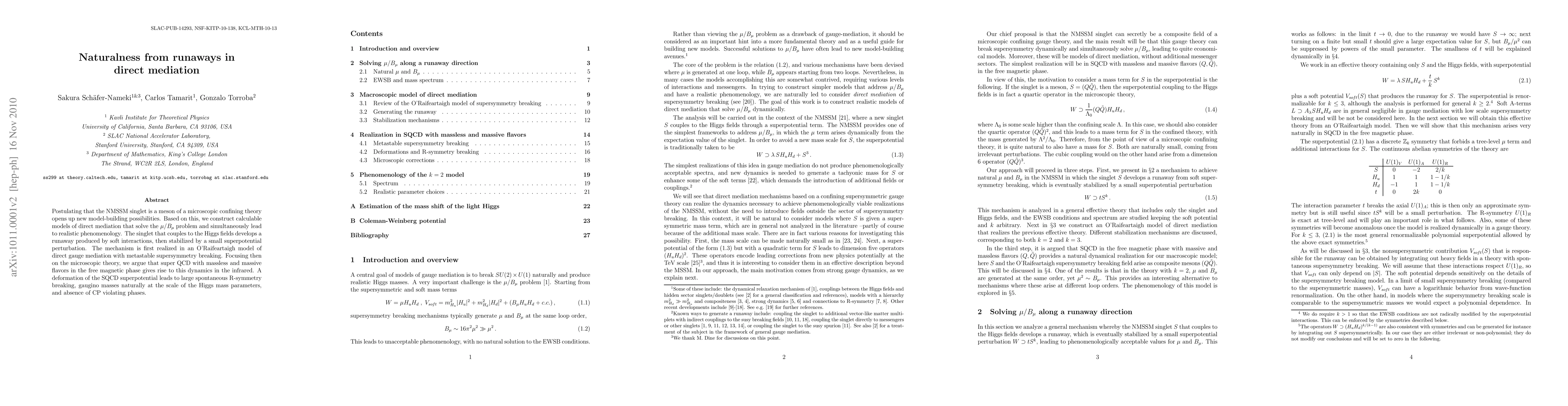 Postulating that the NMSSM singlet is a meson of a microscopic confining theory opens up new model-building possibilities. Based on this, we construct calculable models of direct mediation that solve the mu/Bmu problem and simultaneously lead to realistic phenomenology. The singlet that couples to the Higgs fields develops a runaway produced by soft interactions, then stabilized by a small superpotential perturbation. The mechanism is first realized in an O'Raifeartaigh model of direct gauge mediation with metastable supersymmetry breaking. Focusing then on the microscopic theory, we argue that super QCD with massless and massive flavors in the free magnetic phase gives rise to this dynamics in the infrared. A deformation of the SQCD superpotential leads to large spontaneous R-symmetry breaking, gaugino masses naturally at the scale of the Higgs mass parameters, and absence of CP violating phases.