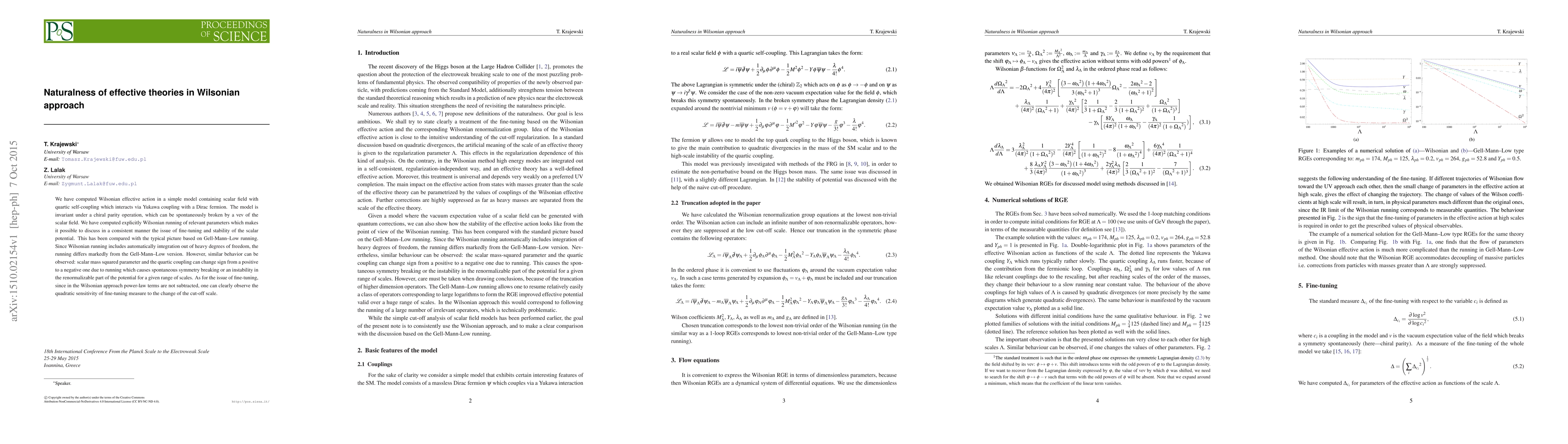 We have computed Wilsonian effective action in a simple model containing scalar field with quartic self-coupling which interacts via Yukawa coupling with a Dirac fermion. The model is invariant under a chiral parity operation, which can be spontaneously broken by a vev of the scalar field. We have computed explicitly Wilsonian running of relevant parameters which makes it possible to discuss in a consistent manner the issue of fine-tuning and stability of the scalar potential. This has been compared with the typical picture based on Gell-Mann-Low running. Since Wilsonian running includes automatically integration out of heavy degrees of freedom, the running differs markedly from the Gell-Mann-Low version. However, similar behavior can be observed: scalar mass squared parameter and the quartic coupling can change sign from a positive to a negative one due to running which causes spontaneous symmetry breaking or an instability in the renormalizable part of the potential for a given range of scales. As for the issue of fine-tuning, since in the Wilsonian approach power-law terms are not subtracted, one can clearly observe the quadratic sensitivity of fine-tuning measure to the change of the cut-off scale.