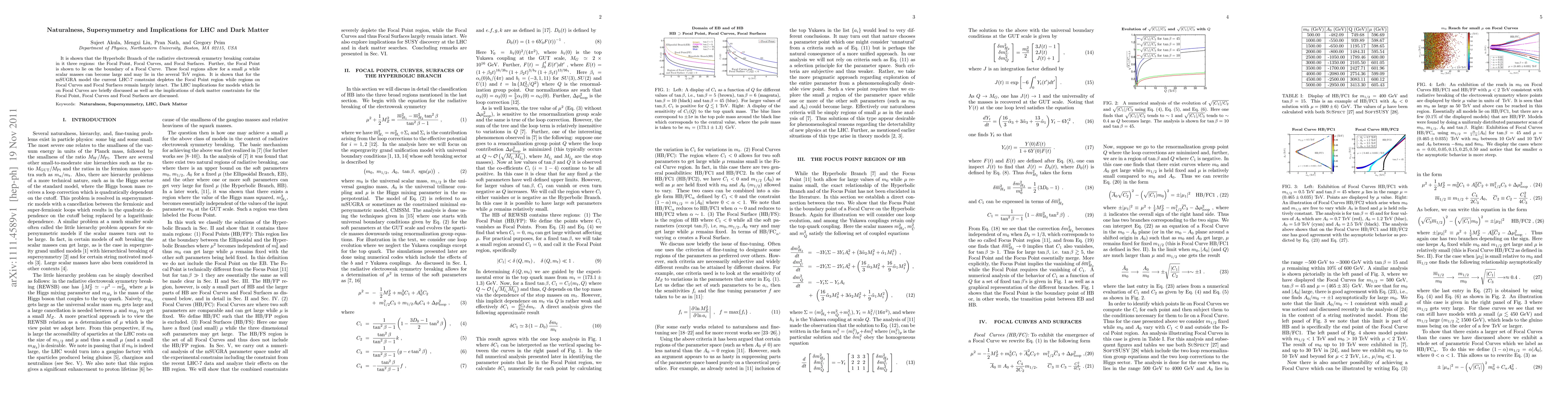 It is shown that the Hyperbolic Branch of the radiative electroweak symmetry breaking contains in it three regions: the Focal Point, Focal Curves, and Focal Surfaces. Further, the Focal Point is shown to lie on the boundary of a Focal Curve. These focal regions allow for a small $\mu$ while scalar masses can become large and may lie in the several TeV region. It is shown that for the mSUGRA model the current LHC-7 constraint depletes the Focal Point region while regions on Focal Curves and Focal Surfaces remain largely intact. The LHC implications for models which lie on Focal Curves are briefly discussed as well as the implications of dark matter constraints for the Focal Point, Focal Curves and Focal Surfaces are discussed.