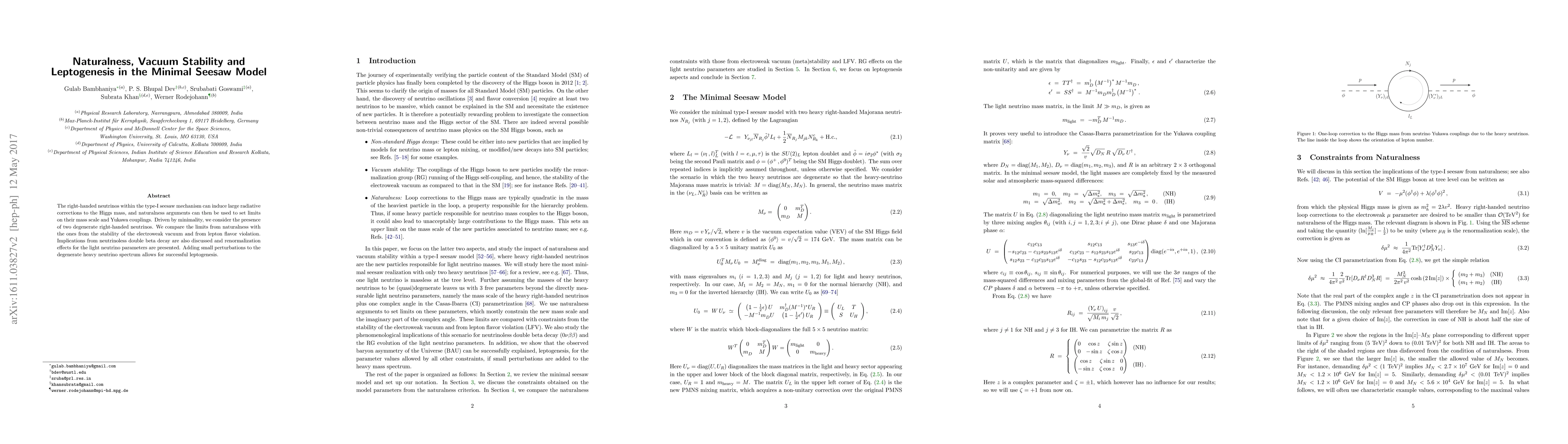This paper explores the minimal seesaw model with two degenerate right-handed neutrinos, analyzing naturalness constraints, vacuum stability, and implications for leptogenesis. It finds that small perturbations in the heavy neutrino spectrum can enable successful leptogenesis while satisfying all theoretical constraints.